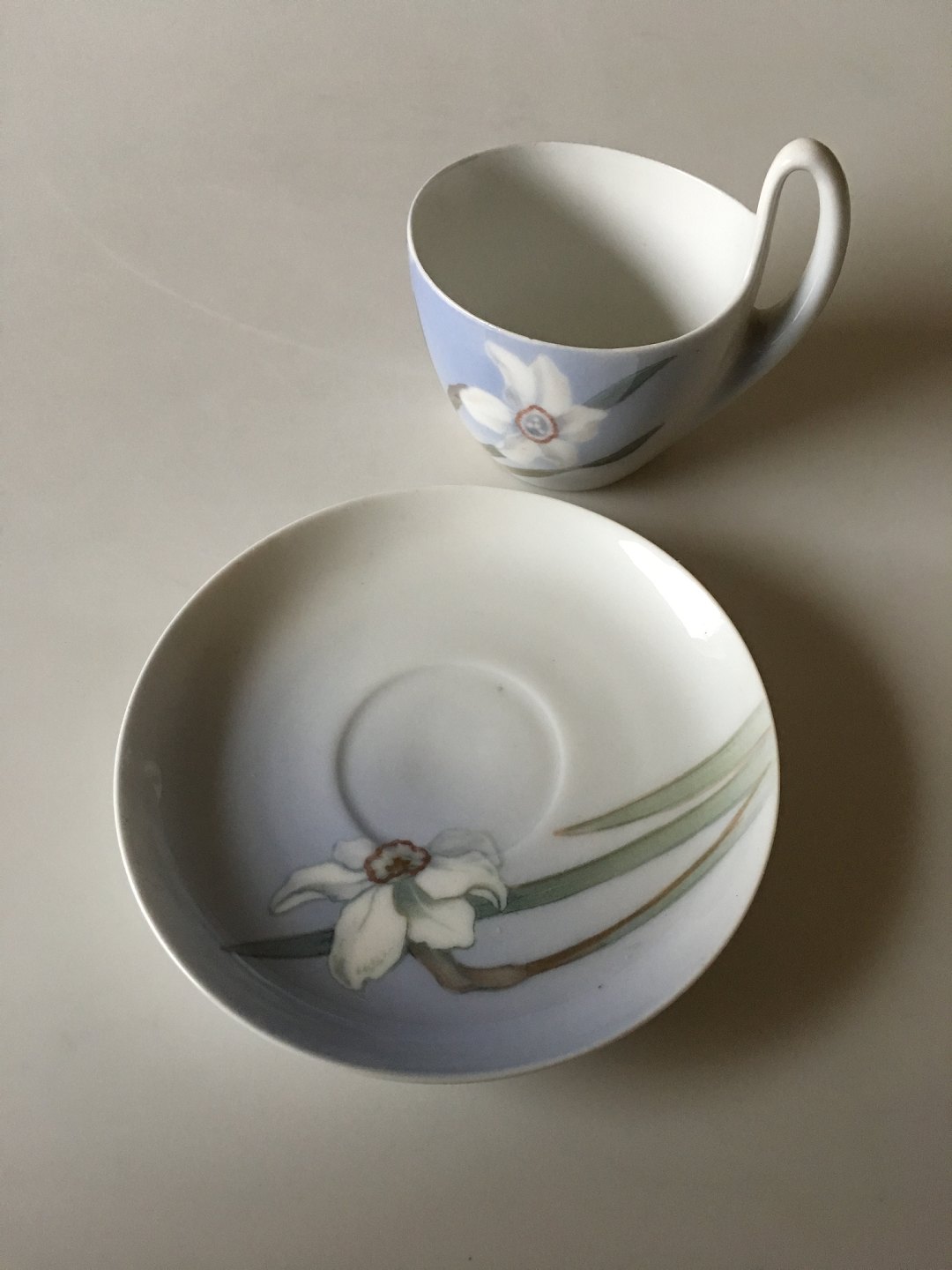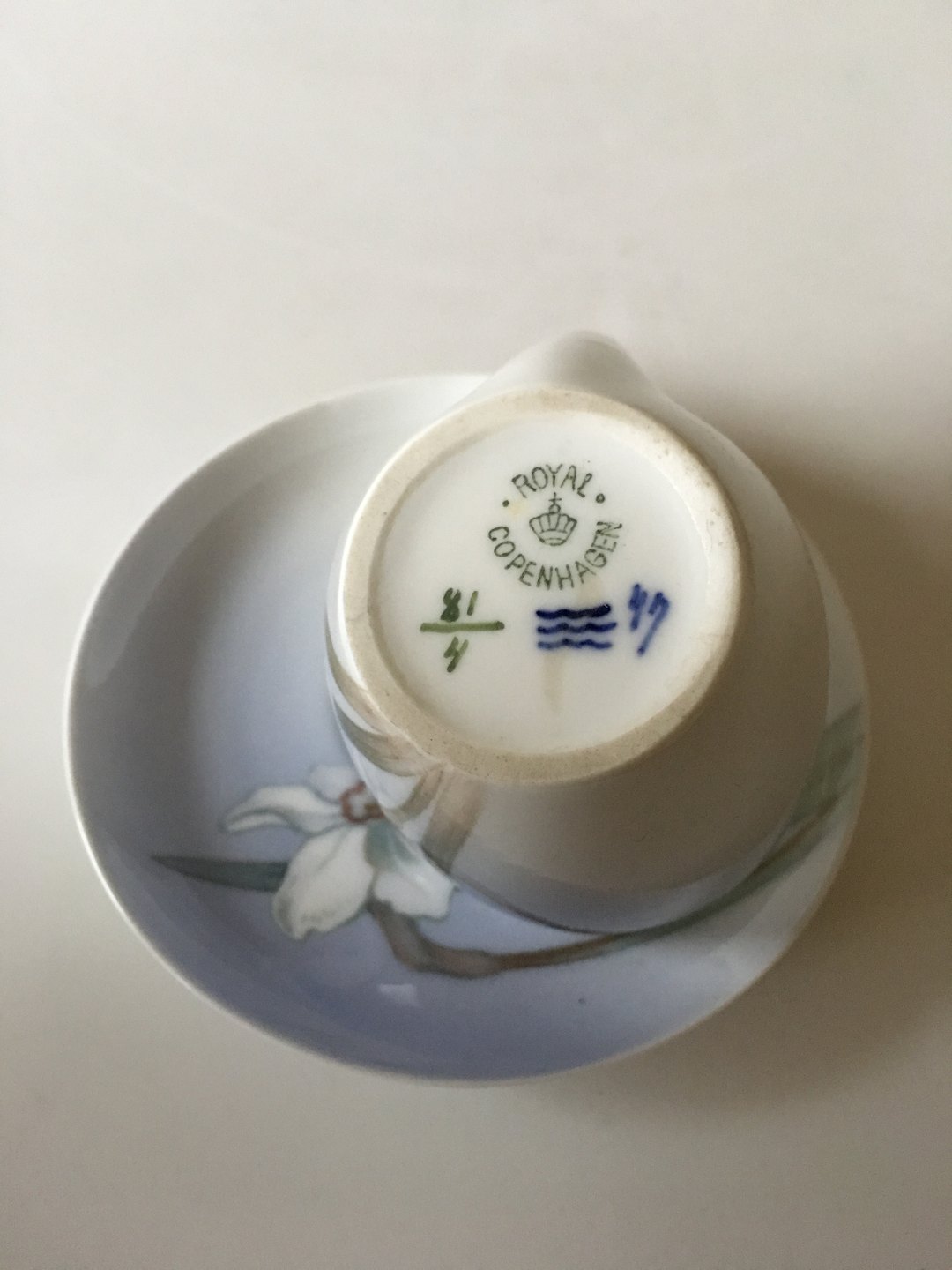 Royal Copenhagen Art Nouveau Small High Handled Cup and Saucer No. 81/4. Cup and Saucer are in fine condition. Cup measures 5.2 cm H (8 cm H measured to the top of the handle). 2nd Quality