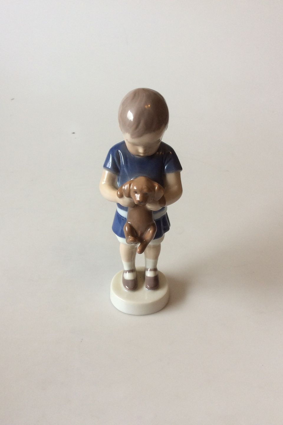Bing og Grøndahl Figur - Dreng der holder en hund/Ole No. 1747. Designet af Ingeborg Plockross-Irminger. Måler 16,5 cm / 6.5 in.