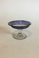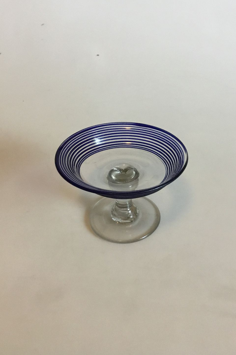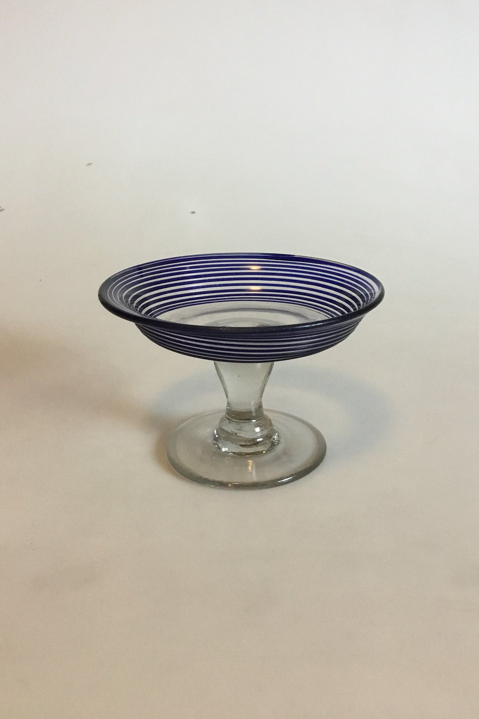 Holmegaard Sukkerfad/sukkeropsats på omvendt balusterstilk, flad udsvejet kumme med blå rand og spiral af blå tråd. Ca. 1865. Måler 11,5 cm dia. x 7,3 cm højt.