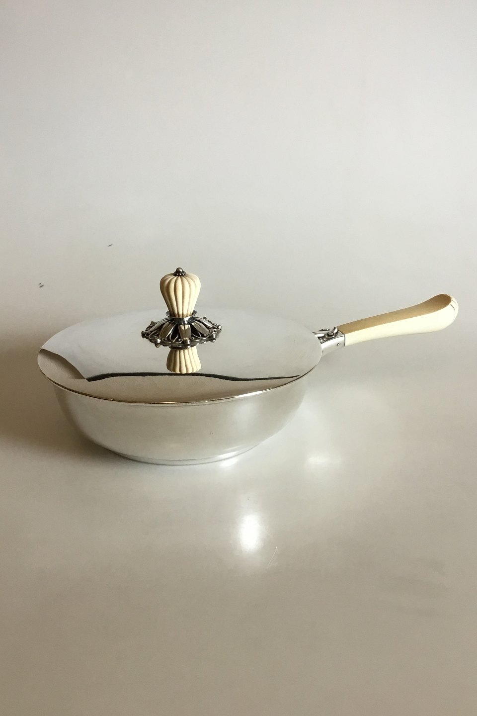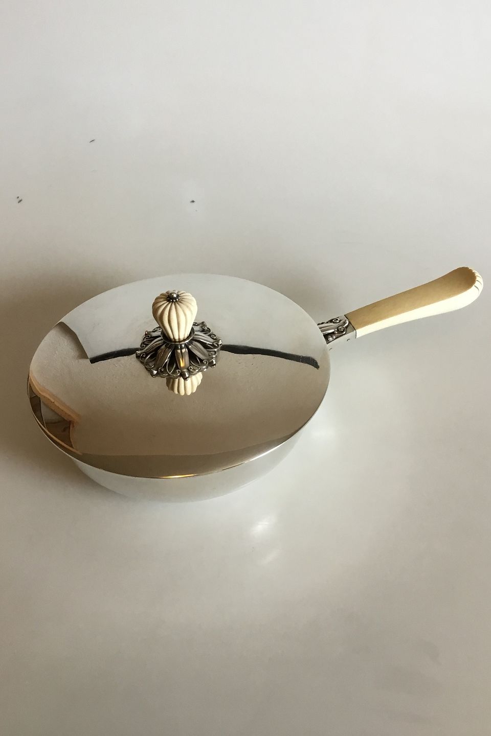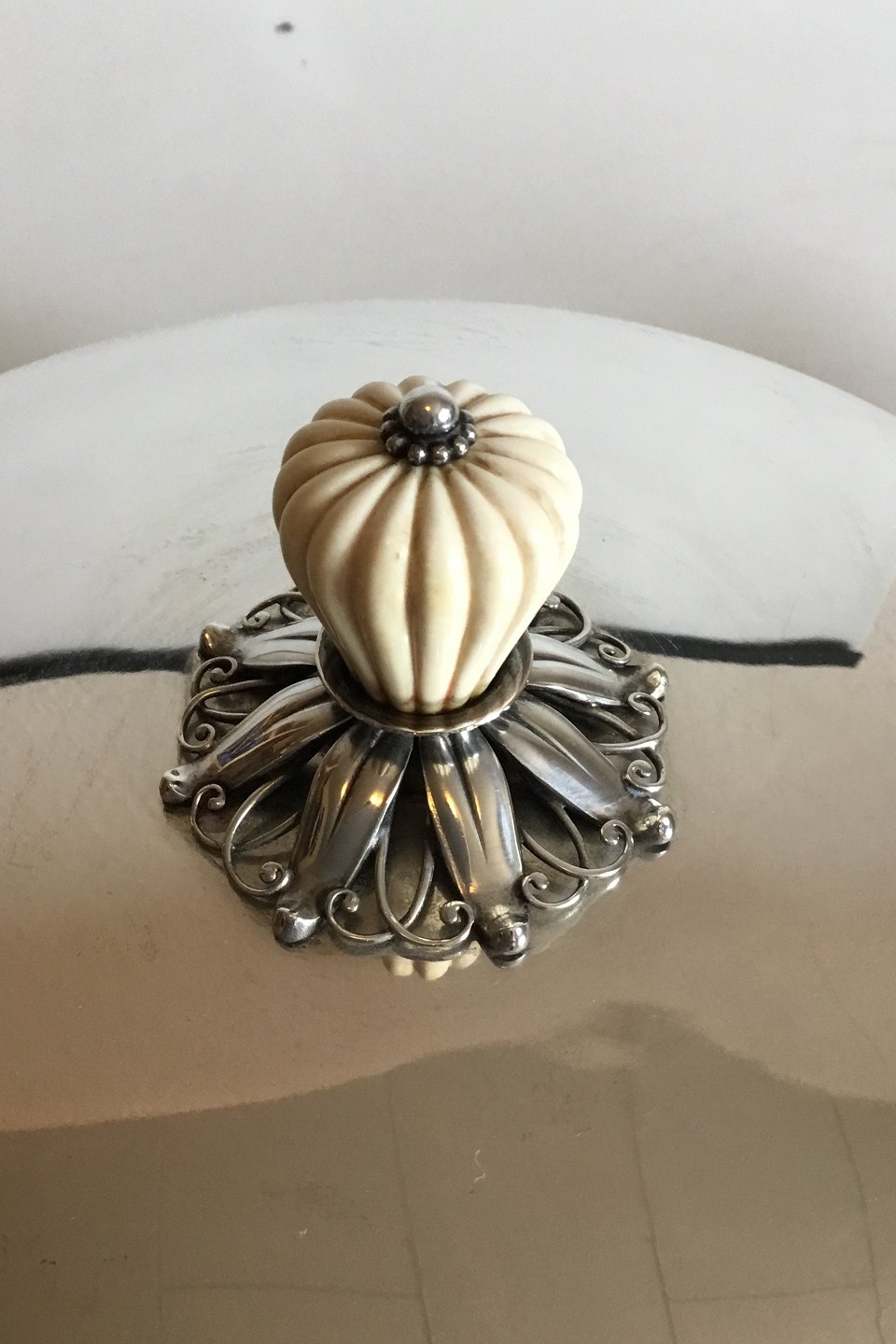 Evald Nielsen Sterling Sølv Lågfad med Lågknop og håndtag af udskåret Elfenben. Måler 34 cm. Vejer 813 gram.