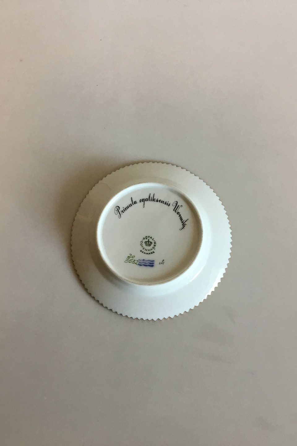 Royal Copenhagen Flora Danica Kagetallerken No 20/3552. Måler 14,4 cm. 1. Sortering. Latinsk navn: "Primula egaliksensis Warmskj."