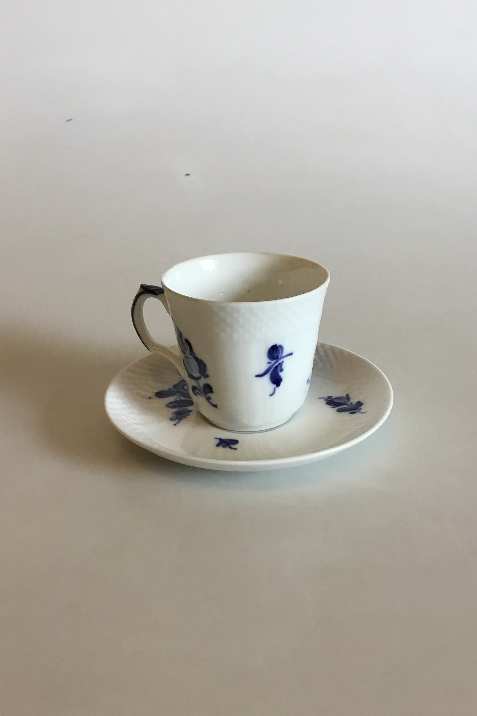 Royal Copenhagen Blå Blomst Svejfet Mokkakop med underkop No 1546. Måler 6 cm x 6,5 cm