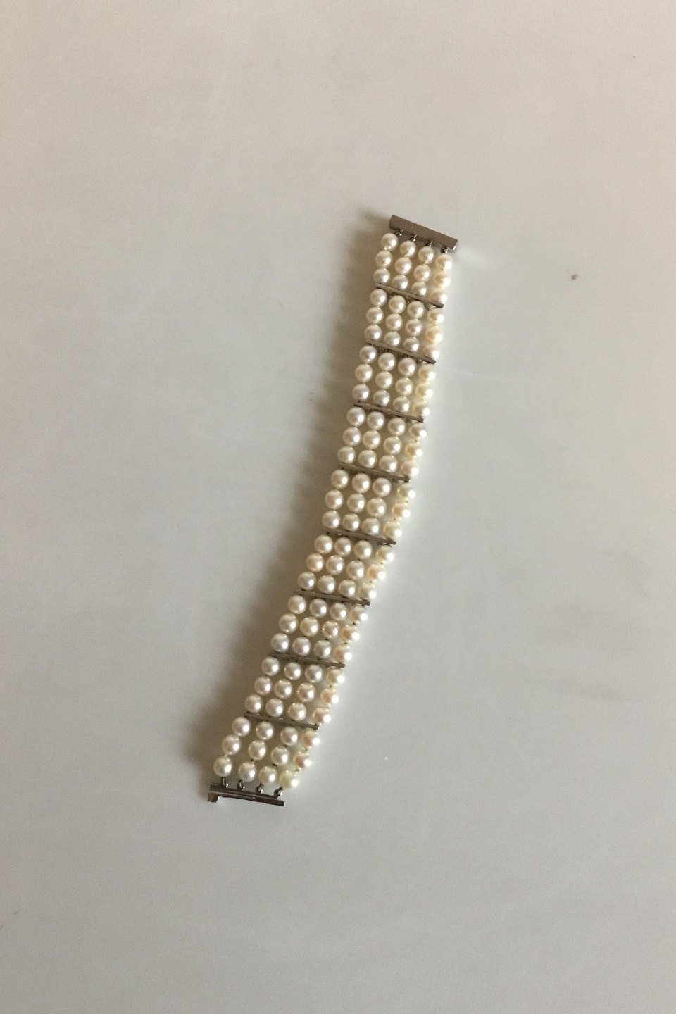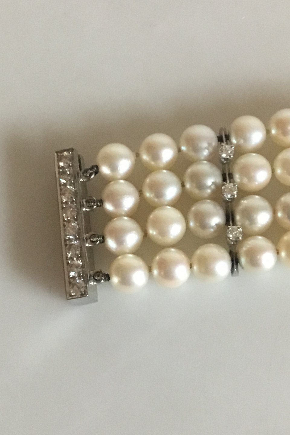 Georg Jensen & Wendel 14 K Hvidgulds armånd med perler og brillanter. Består af 108 perler og 32 brillanter. Måler 20 cm. Vejer 50,3 gram