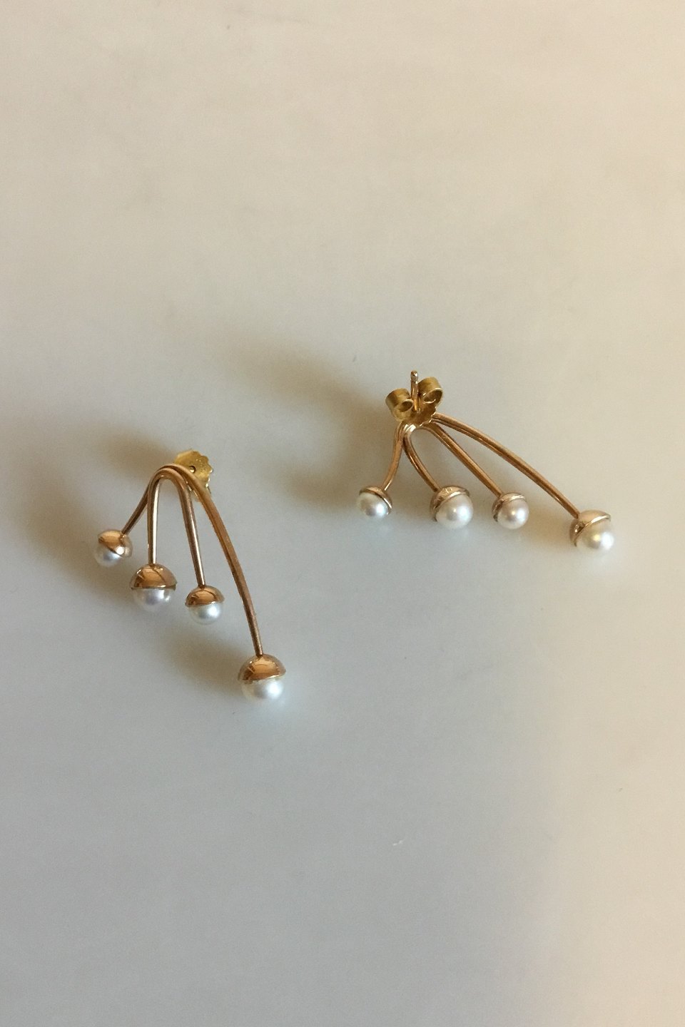 Bent Knudsen Secmented Necklace and Earsticks in 14 K Gold with Pearls. Measures Necklace cm / 17 23/32 in, Weighs 1.34 oz. Earsticks 3 cm / 1 3/16 in. Weighs 0.18 oz.