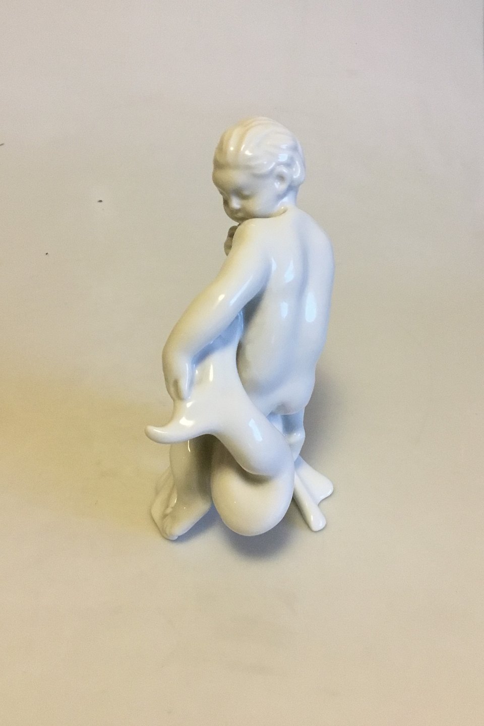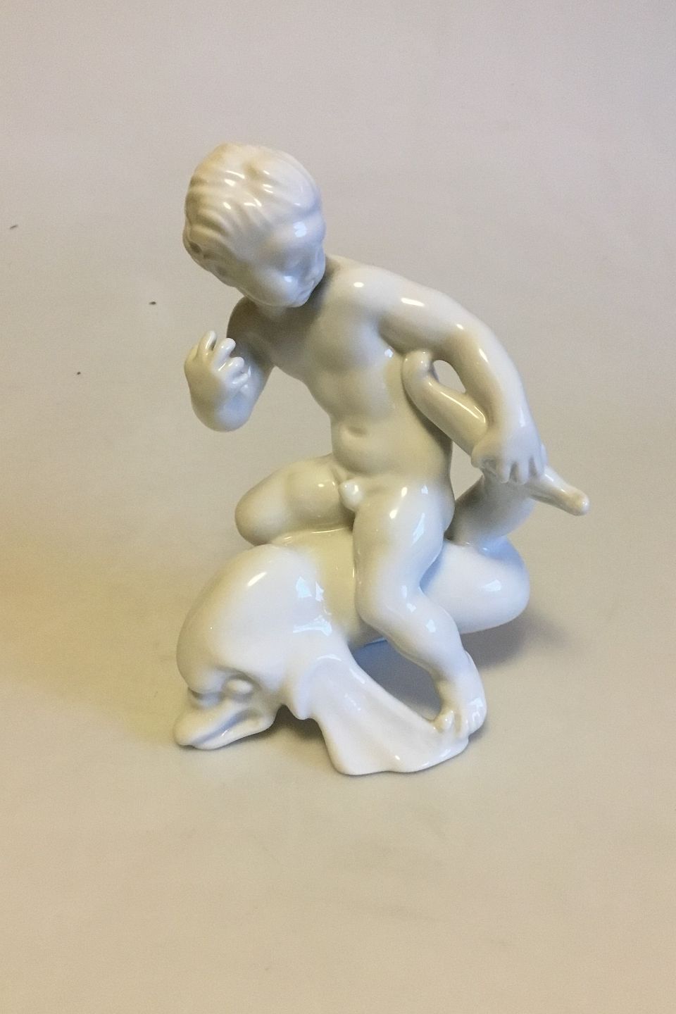 Bing & Grøndahl Blanc de Chine Figur af Dreng der holder på delfin No 4060. Designet af Kai Nielsen. Måler 20 cm