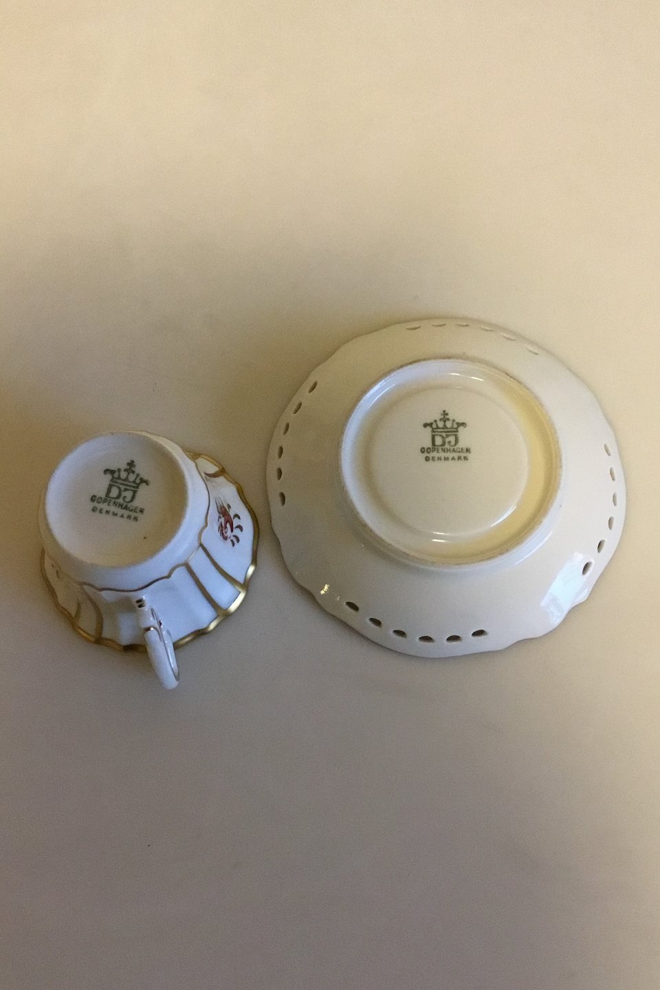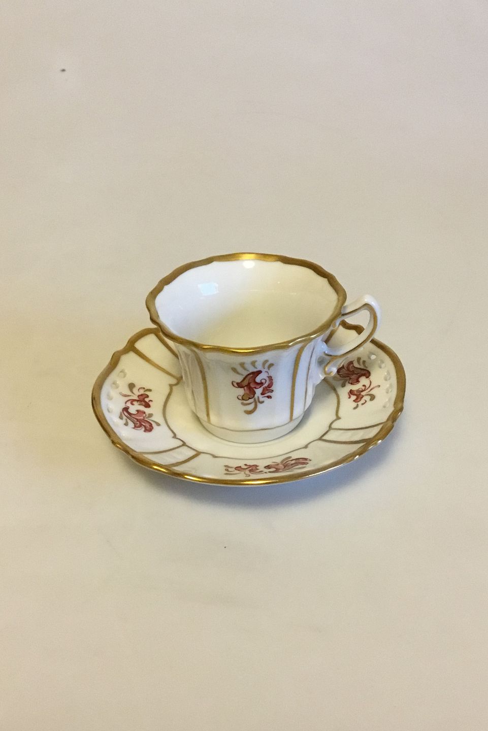 Dahl Jensen Dronning Mokkakop med underkop med guld og gennembrudt kant. Måler Kop: 7 cm dia. Underkop 12 cm dia.