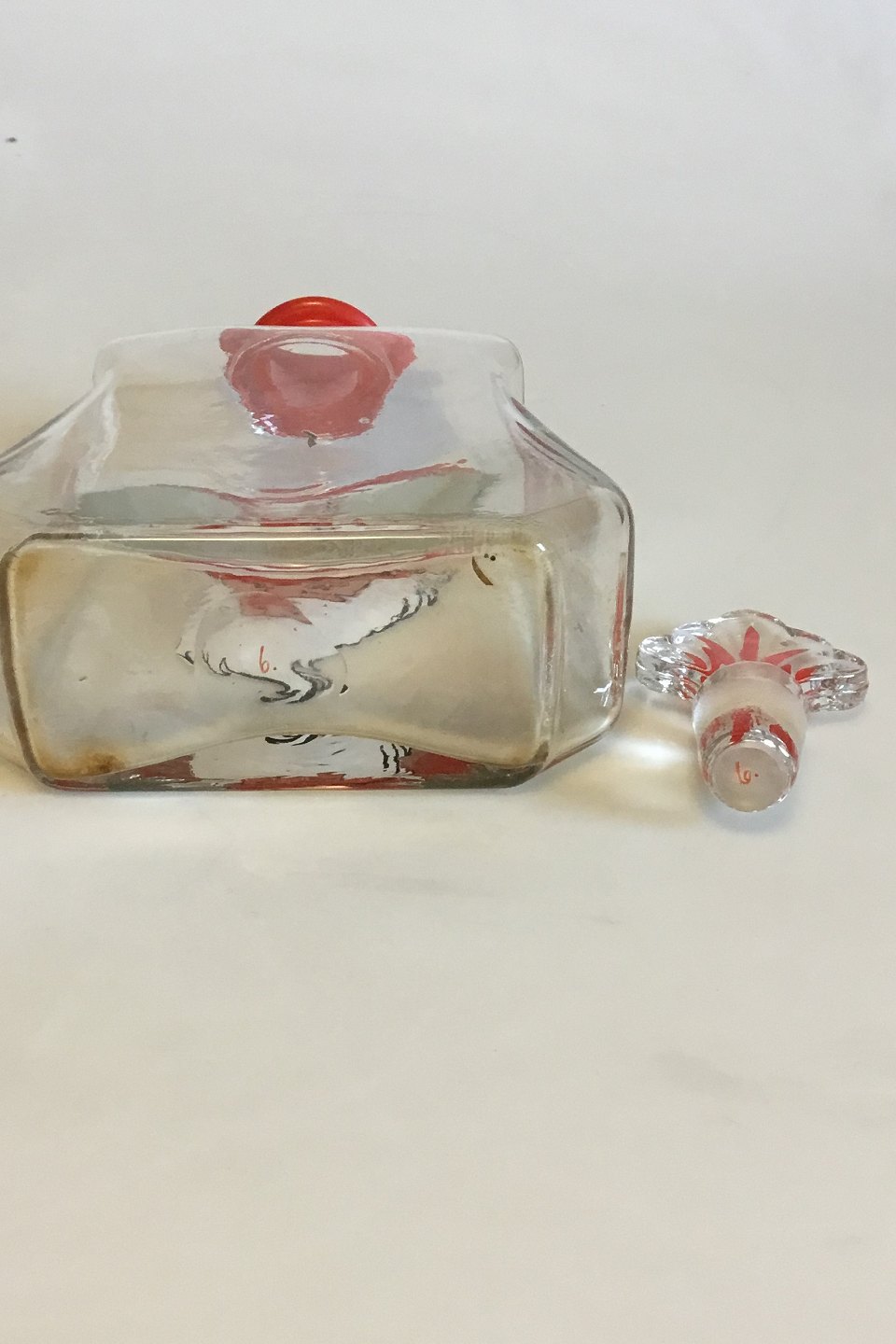 Christmas carafe with 8 small glasses. Decorated with Santa Claus. The Carafe is spherical grinded at the bottom and labeled "6". A glass with chip. Measures Carafe: 22 cm / 8 21/32 in. Glass: 7.5 cm / 2 61/64 in.
