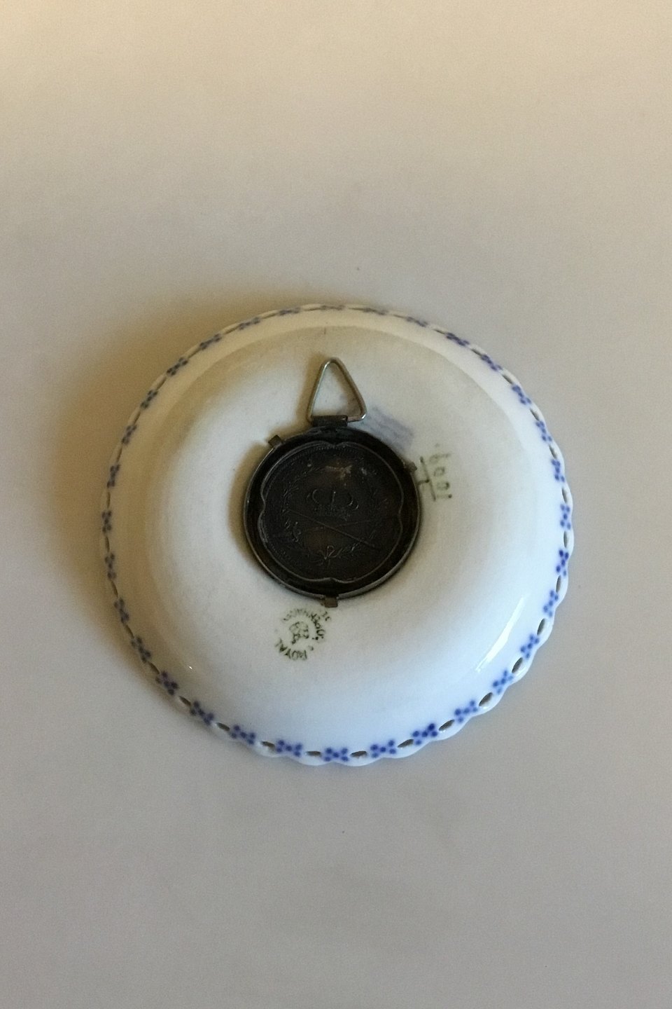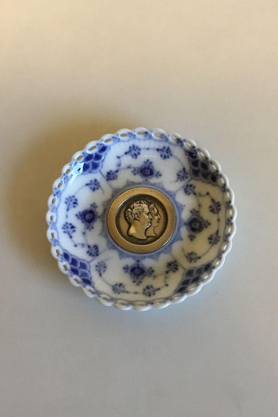 Royal Copenhagen Musselmalet Helblonde Lysmanchet med monteret med 2-Kronemønt med Christian VIII og Caroline Amalie, 1860. No 1009. Måler 9,4 cm