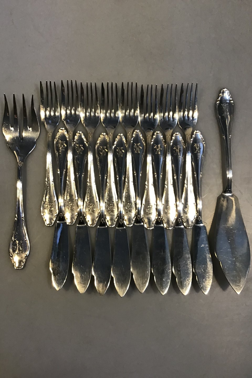 Tysk Plet Fiskebestik til 8 Pers samt Serveringsdele (Alle dele med gravering) Gaffel 18.3 cm Kniv 20.5cm Serveringsdele 21.5 og 25.5 cm