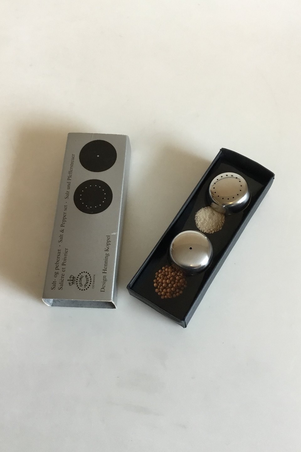 Georg Jensen Stainless Steel Salt & Pepper Set. Designed by Henning Koppel. Measures 3.5 cm / 1 3/8 in. dia.