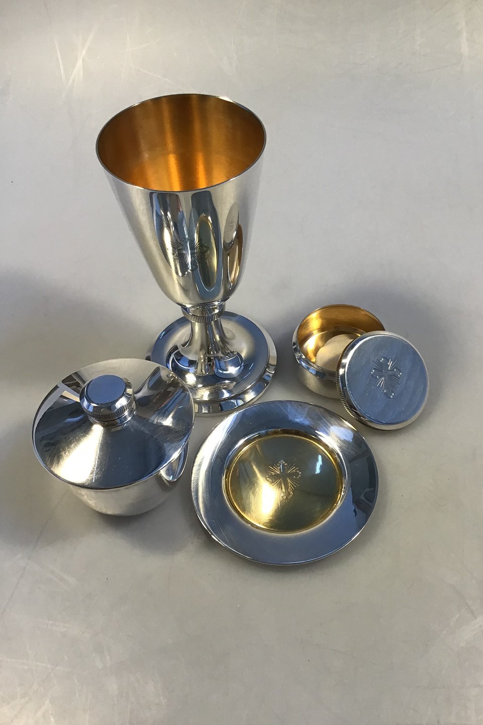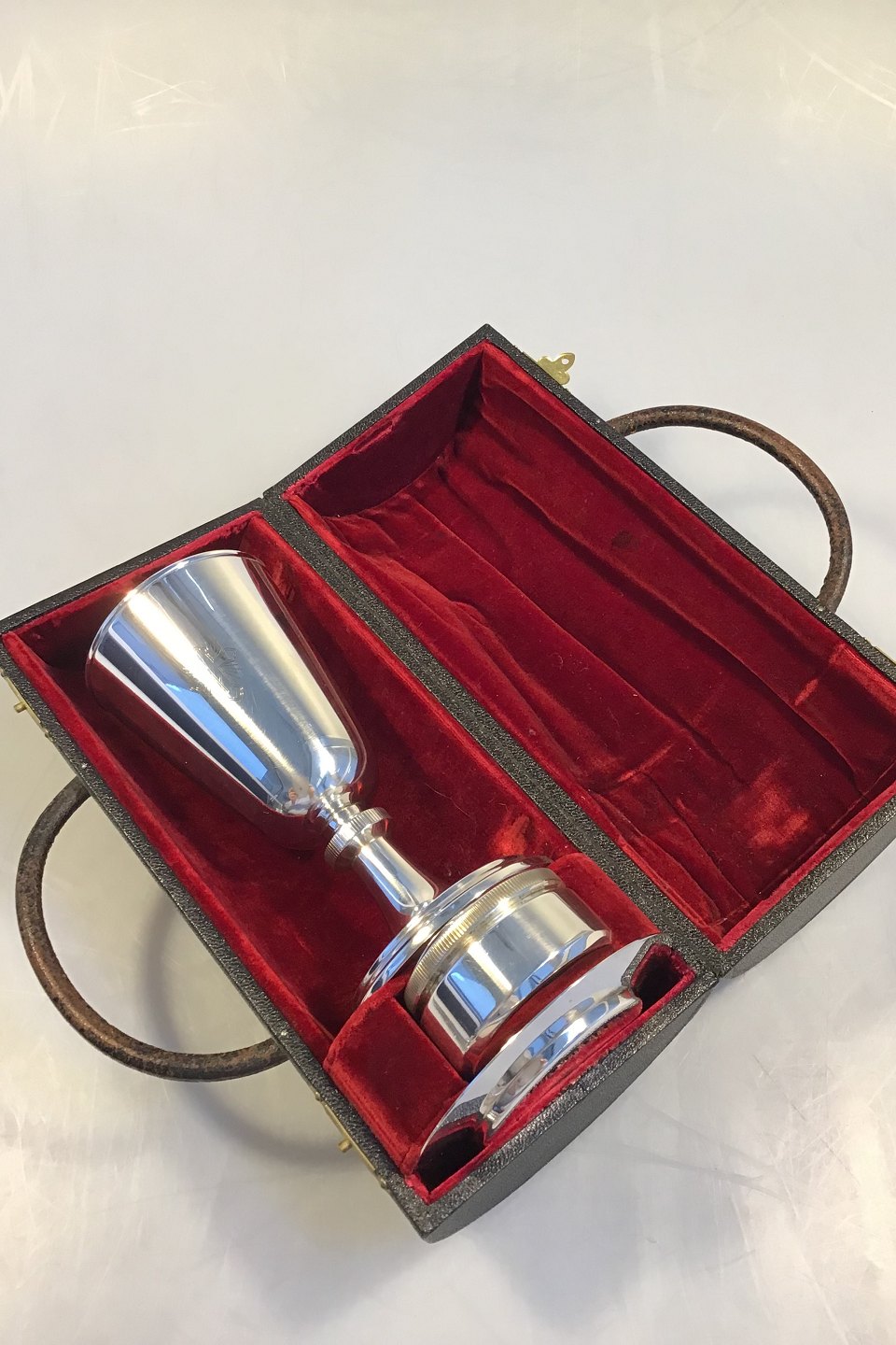 C.C. Hermann Tranportable Sterling Silver Altar Set comprising chalice, container, hostie box and -dish. Partially gilded. In fitted case. H. 18 cm./7.08" Diam. 9 cm./3.54" Weight 360 gr. /12.69 oz