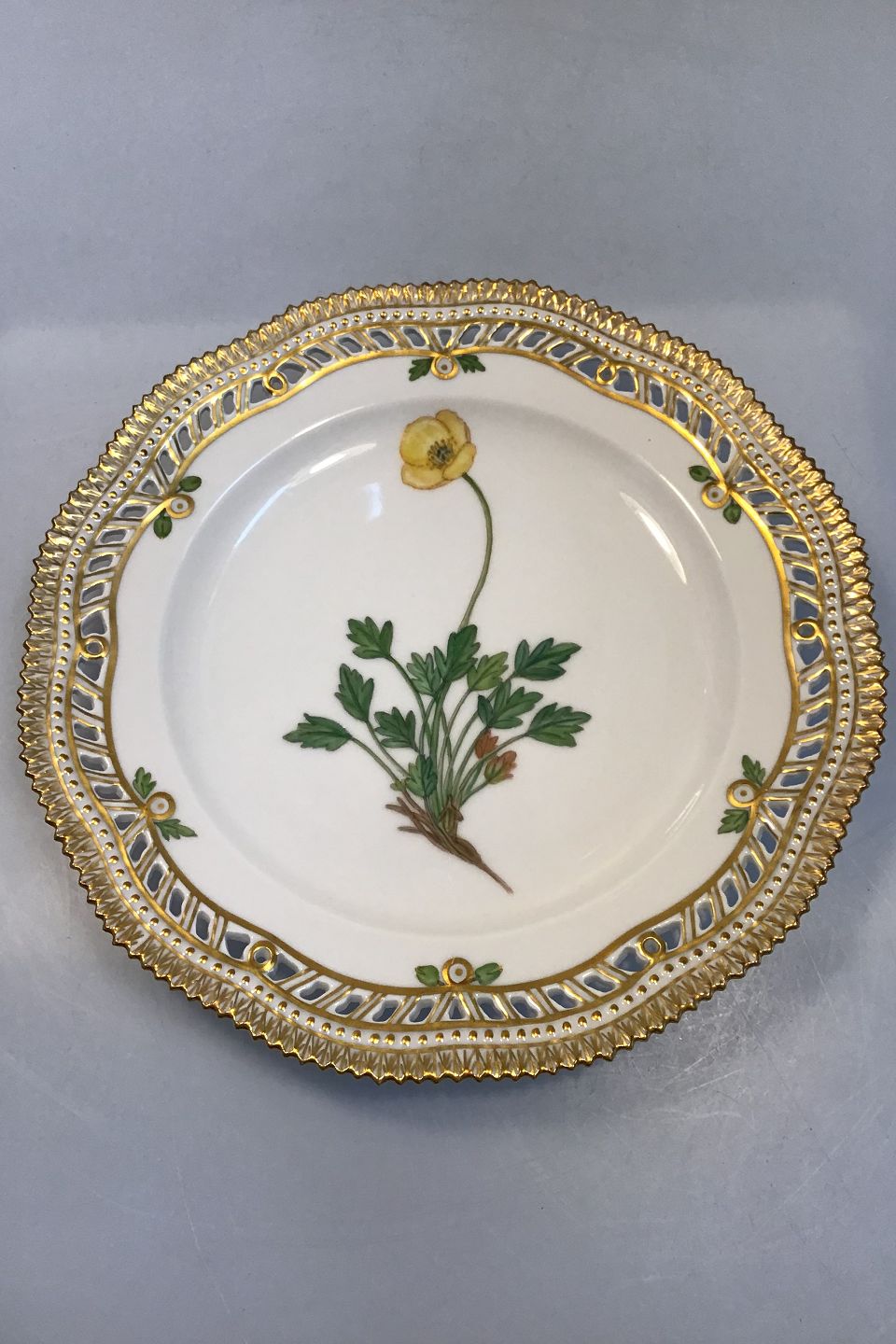 Royal Copenhagen Flora Danica Frokosttallerken No 20/3554 med gennembrudt kant. Latinsk Navn: Papaver nudicaule L (Islandsk valmue). Måler 23 cm. 1. Sort. I perfekt Stand