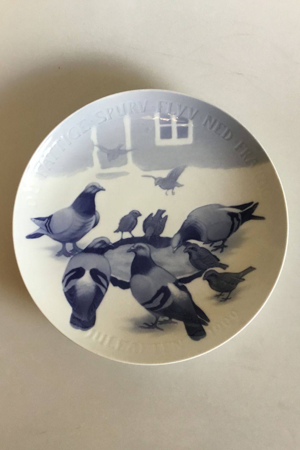 Bing & Grøndahl Stor juleplatte 1909 BG-L1909. Fugl flyv ned fra taget. Måler 33 cm