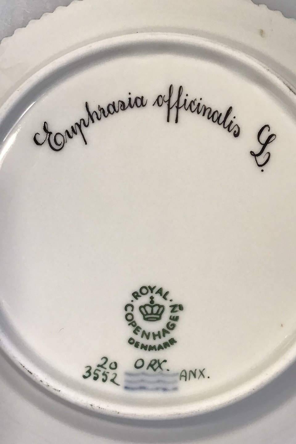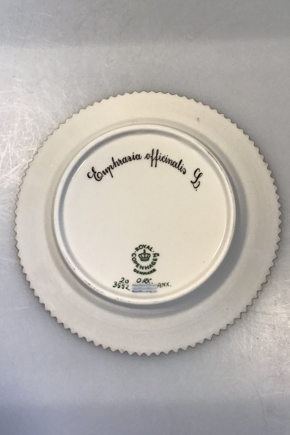 Royal Copenhagen Flora Danica Kagetallerken No 20/3552. Latinsk Navn: Euphrasia officinalis L(Kalk-øjentrøst) Måler 14,3 cm
