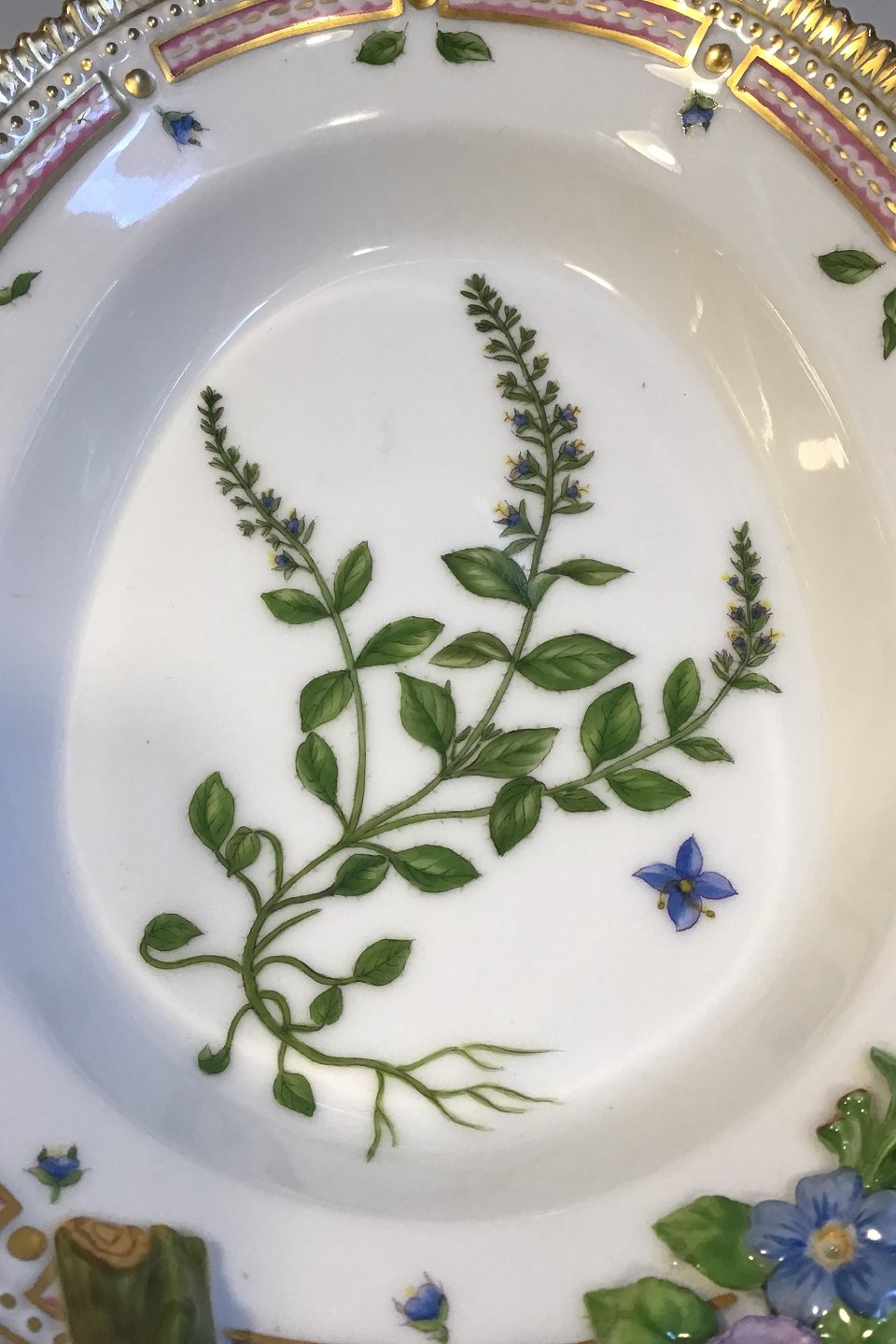 Royal Copenhagen Flora Danica Oval Assiette No20/3540 Latinsk Navn: Veronica avensis L (Mark-ærenpris) Måler 22,5 cm x 17 cm