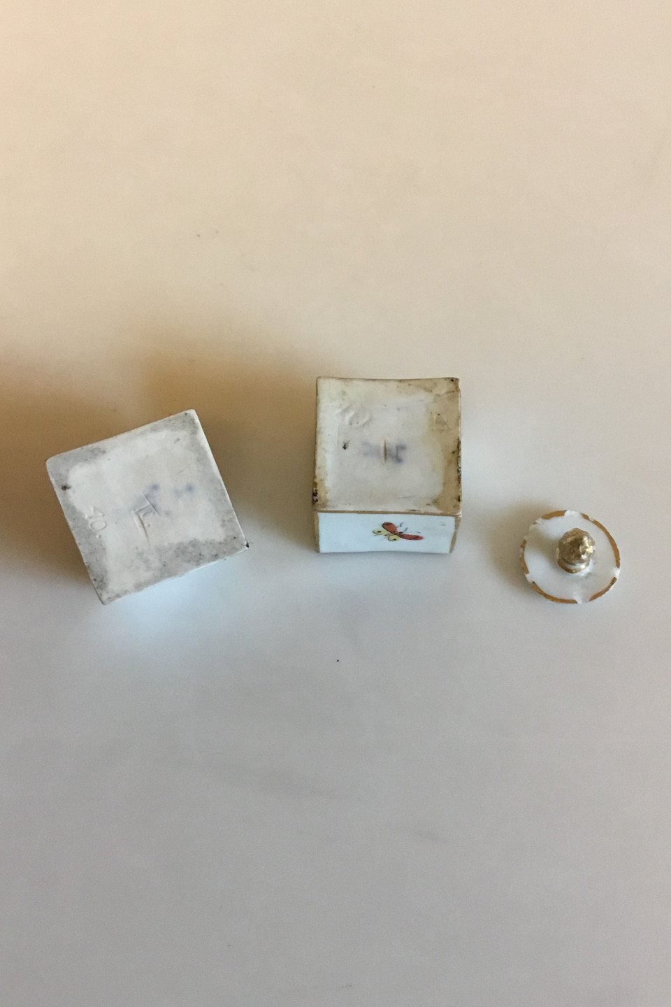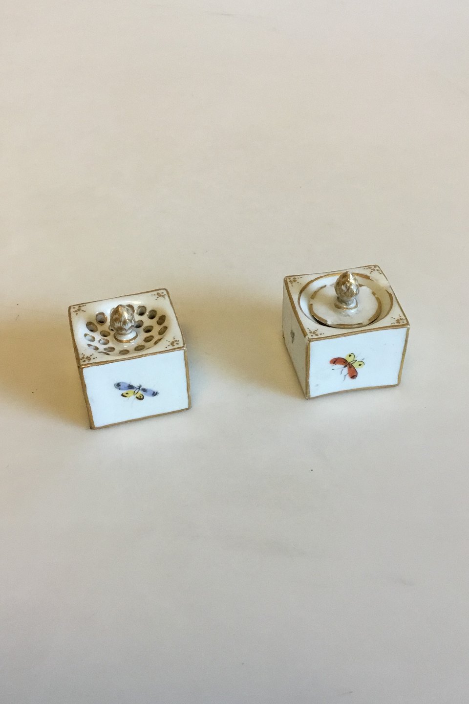 Meissen Salt and Pepper set in porcelain with decoration with Chickens and various insects. Measures 3 cm / 1 3/16 in. x 3 cm / 1 3/16 in. Small chips