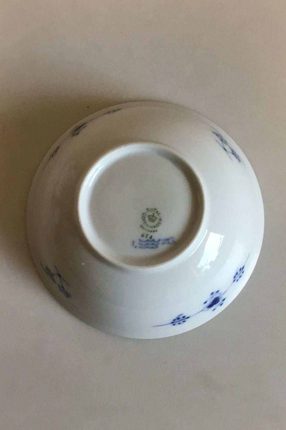 Royal Copenhagen Musselmalet Riflet skål No 574. Måler 14 cm
