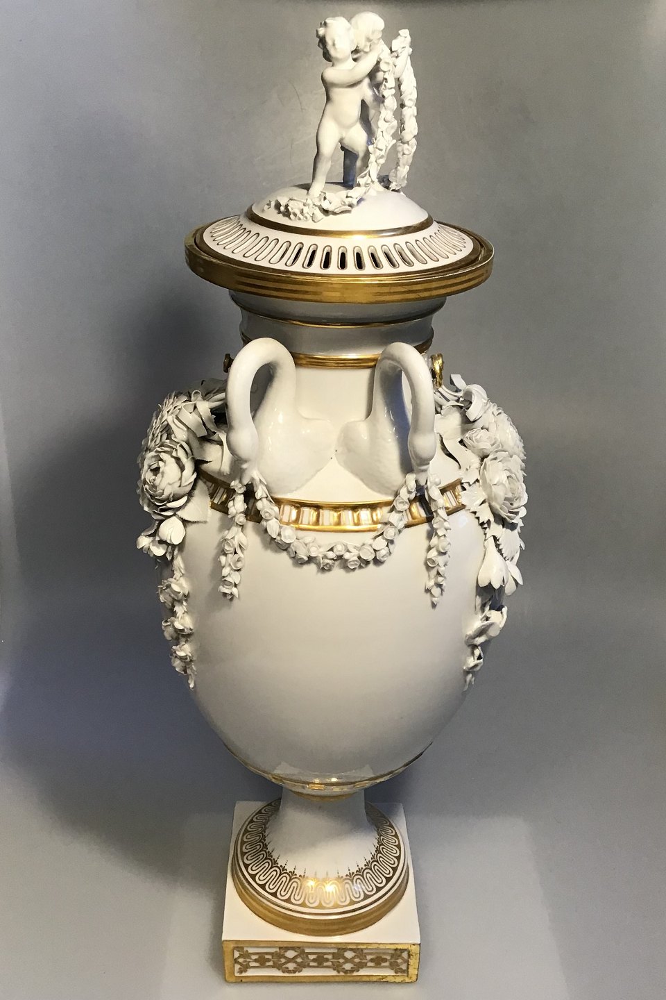 Royal Copenhagen ornamental Vase with Swans (1870-1890) 60 cm (23 5/8 in) Inscription on front(Dedication inside the lid)