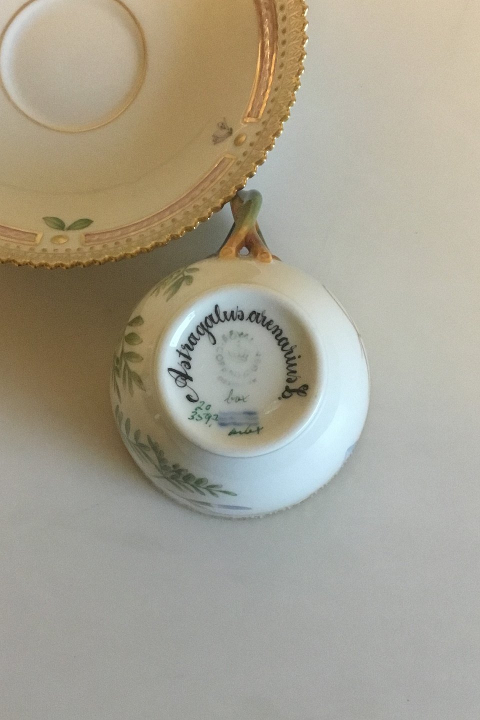 Royal Copenhagen Flora Danica Coffee Cup and Saucer No 20/3597. Latin Name: Astragalus arenarius L. Measures Cup: 7 cm / 2 3/4 in. x 7.5 cm / 2 61/64 in. dia. Saucer: 13.8 cm / 5 7/16 in.