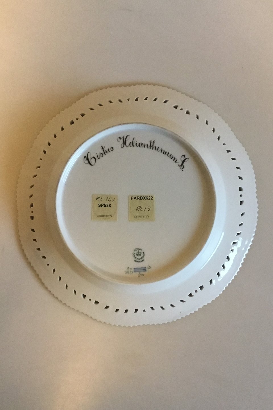 Royal Copenhagen Flora Danica tallerken med gennembrudt kant No 20/3553. Latinsk navn: Cistus Helianthemum L. Måler 25,5 cm