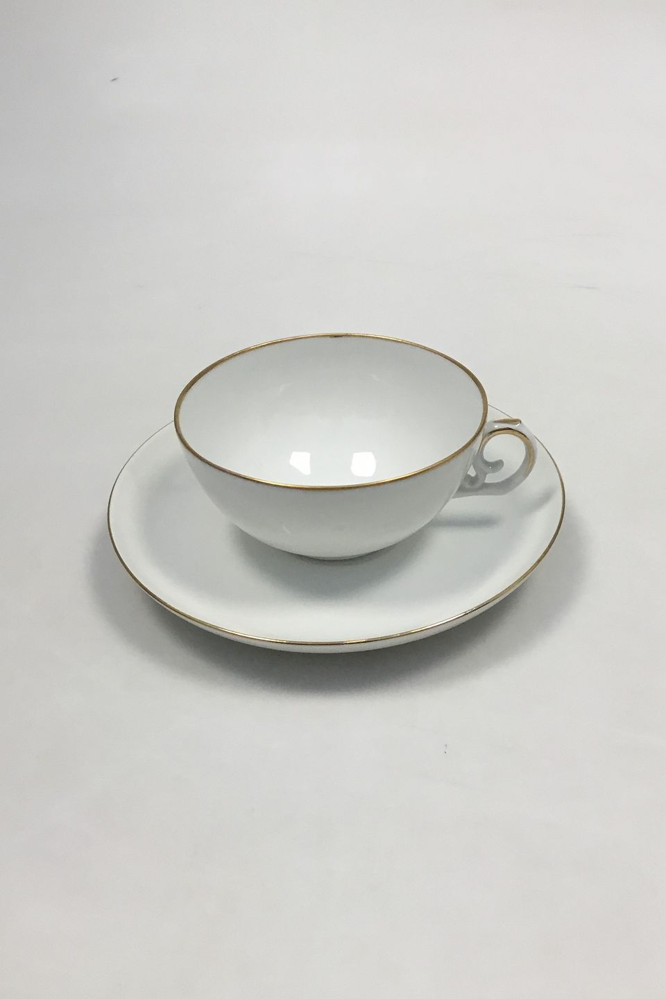 Royal Copenhagen White Porcelain with Gold Tea Cup and Saucer No 1275/9067. Measures Cup: 4.5 cm / 1 49/64 in. x 9.8 cm / 3 55/64 in. Saucer: 14.8 cm / 5 53/64 in.