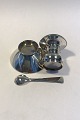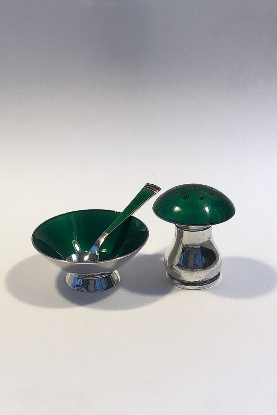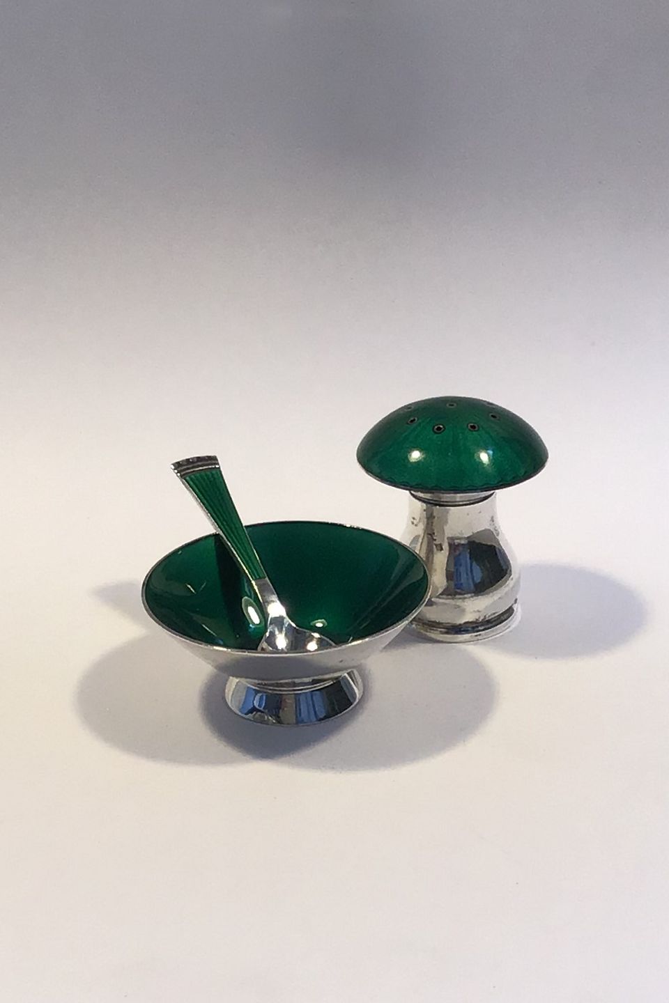 Egon Lauridsen Sterling Silver Salt and Pepper set (Green Enamel) Measures Salt Cellar Diam 5.2 cm(2 3/64 in) Pepper Pot H 4.3 cm(1 11/16 in)