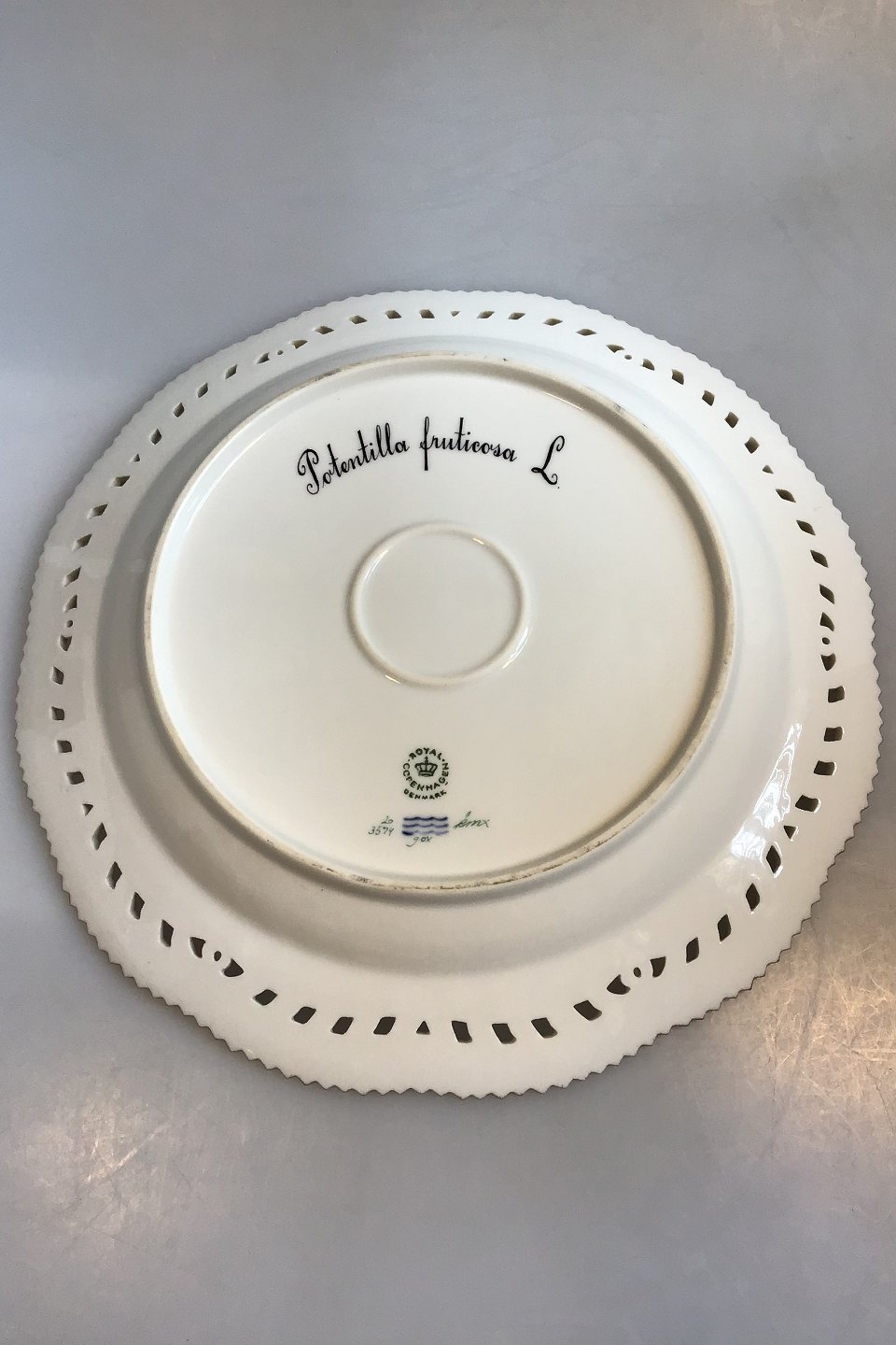 Royal Copenhagen Flora Danica Fad med gennembrudt kant No 20/3574. Latinsk navn: "Potentilla fruticosa L."Måler 28 cm. 1. Sortering.