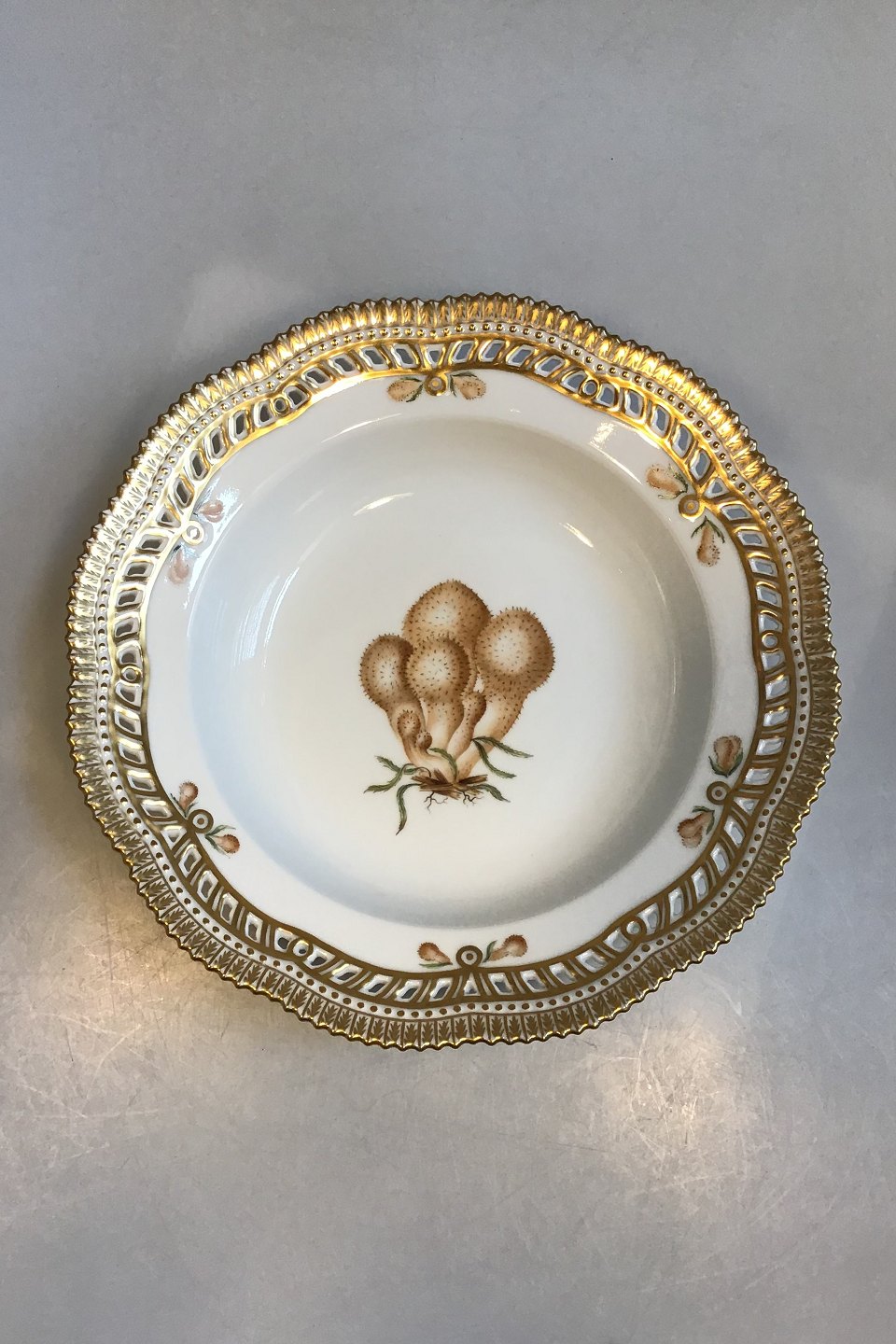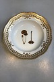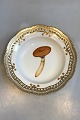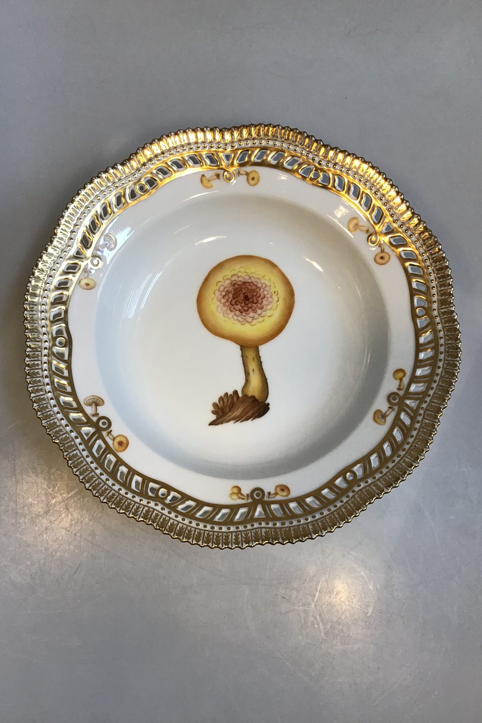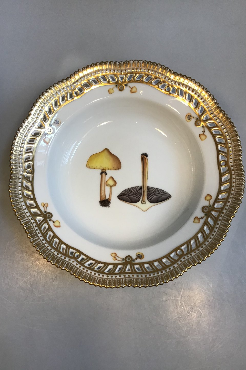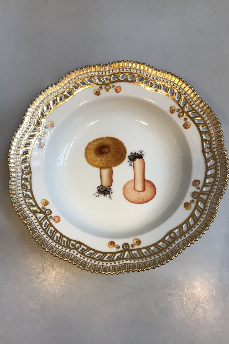 Royal Copenhagen Flora Danica Dyb Tallerken med gennembrudt kant No 634 (20/3547) Latinske Navne: Agaricus scaber Müll, Lycoperdon gemmatum Batsch, Agaricus glutinosus Vahl, Agaricus nitens Vahl, Agaricus semistriatus Vahl, Agaricus torminosus Schäff. Alle Svampe motiver