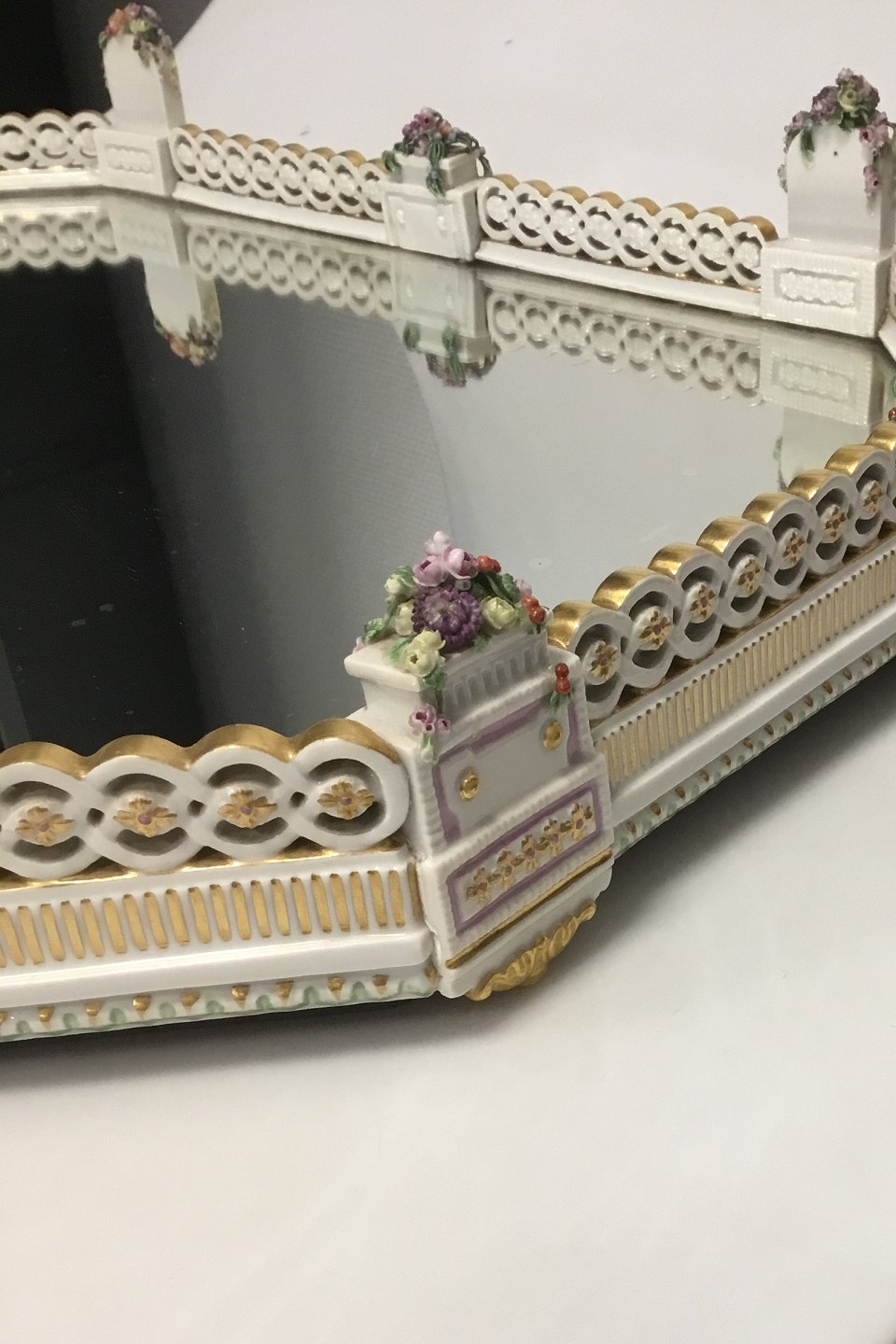 Large Royal Copenhagen Decoration tray with mirror/table garniture. Mirror with discoloration and a few small chips on flowers. Measures 37 cm / 14 9/16 in. x 52 cm / 20 15/32 in.