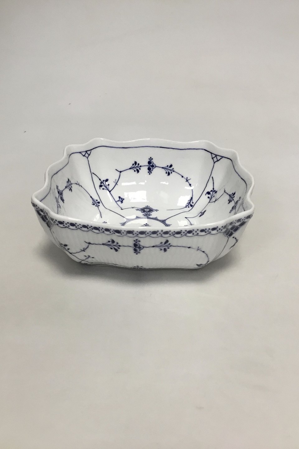 Royal Copenhagen Musselmalet Halvblonde firkantet Skål No 581. Måler 22,6 cm fra side til side, 25 cm fra hjørne til hjørne.