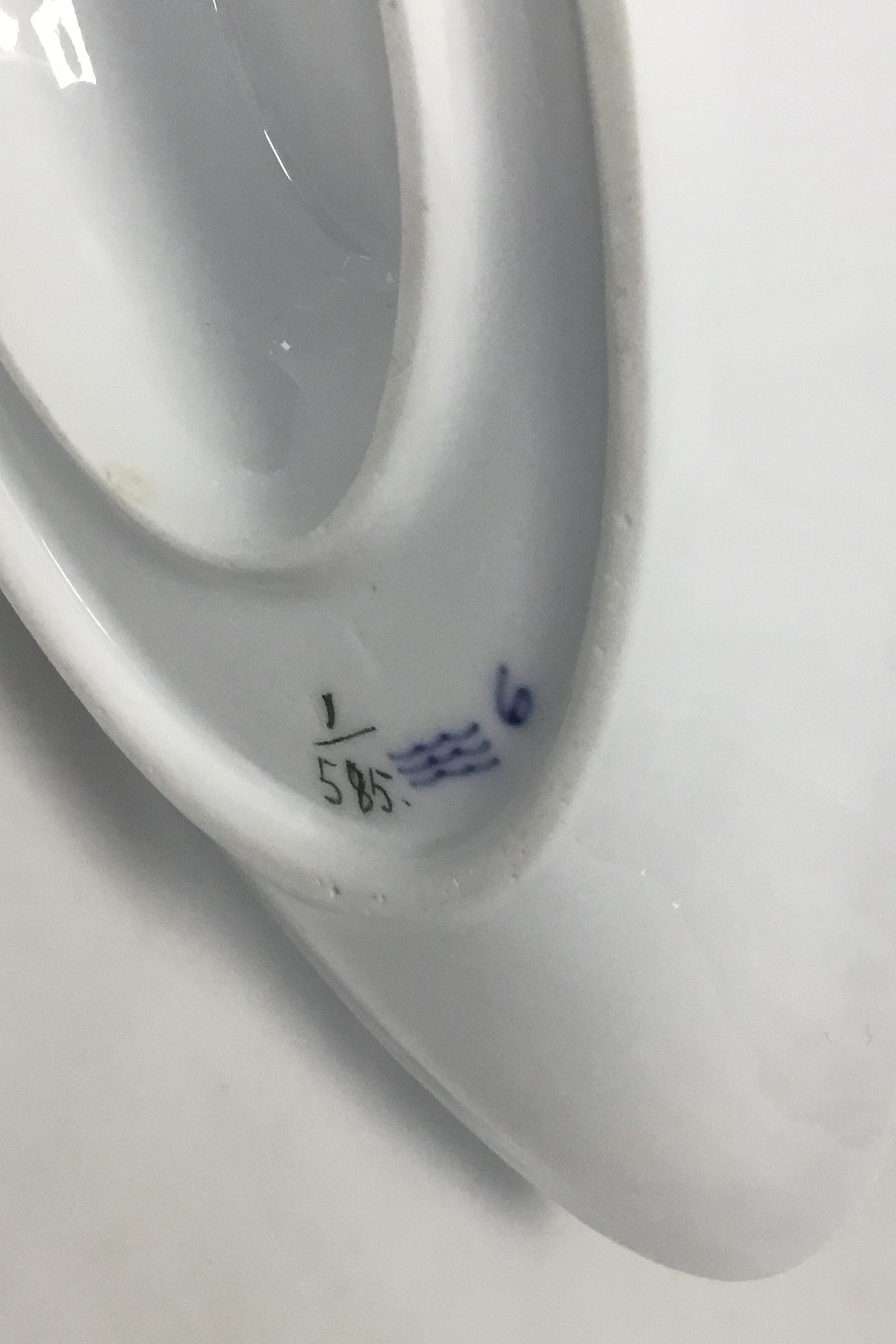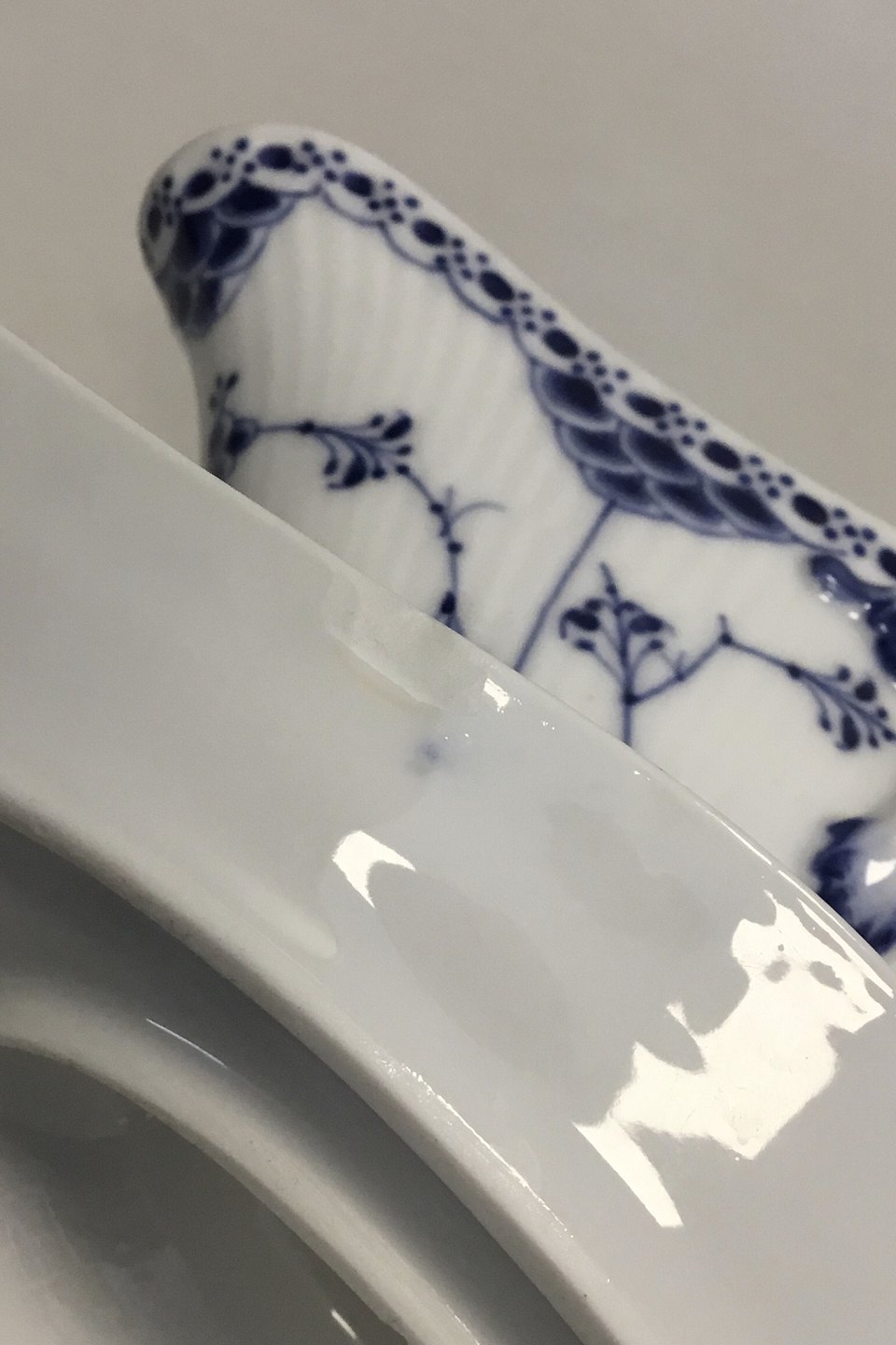Royal Copenhagen Blue Fluted Half Laced Saucebowl with Handles no. 585. Modelled by Erik Nielsen 1890. 10 x 22 cm (3 15/16" x 8 21/32"). Chip under side and a glued chip upper inner rim. Please see pictures