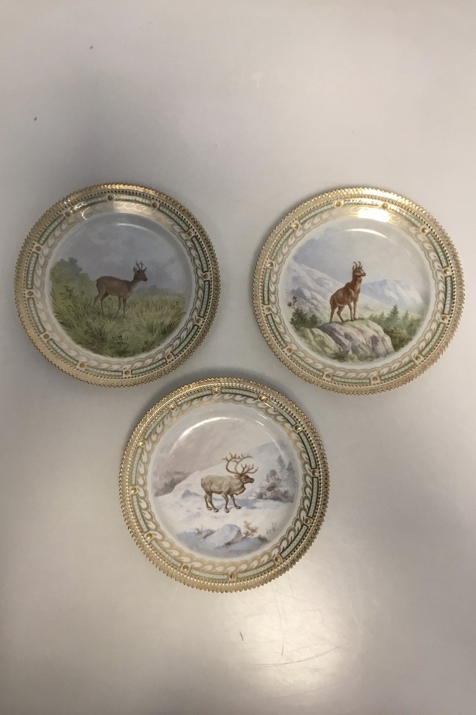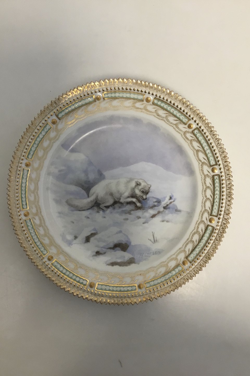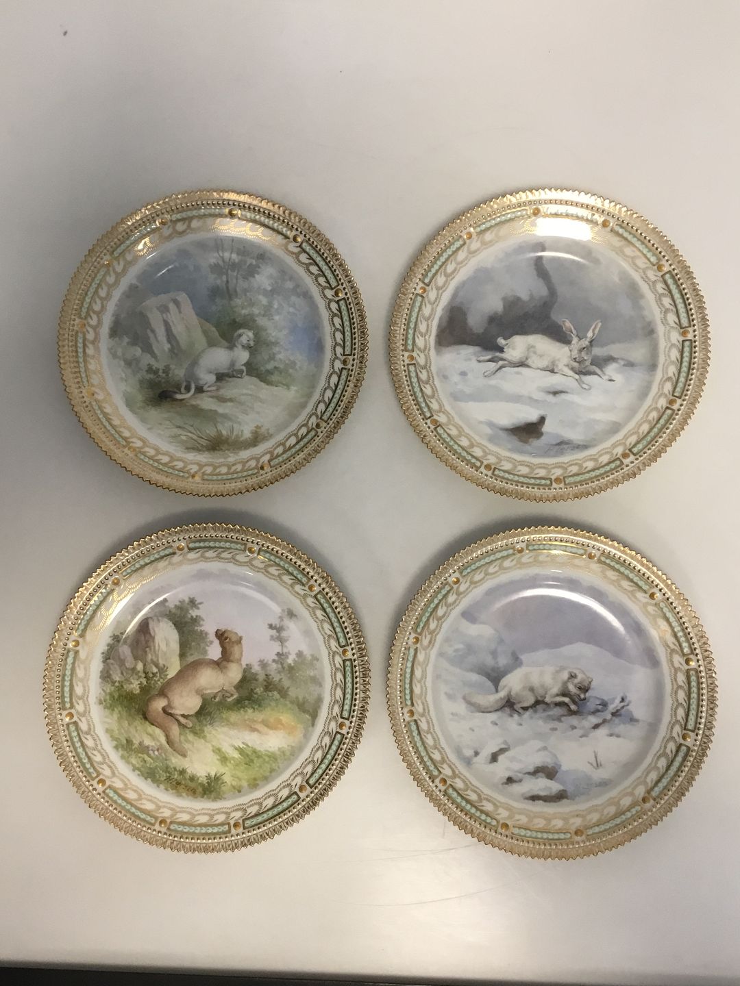 Royal Copenhagen Flora Danica/Fauna Danica Game Luncheon Plates. Inner gold rim with feather design. No 239A/3550 (Set of 7) Measures 22 cm(8 21/32 in) Latin Names: Putorius erminea, Lepus timidus, Putorius furo, Canis lagopus, Cervus caprelus,Capelle rupicapra, Tarandus rangifer. Painter H Larsen