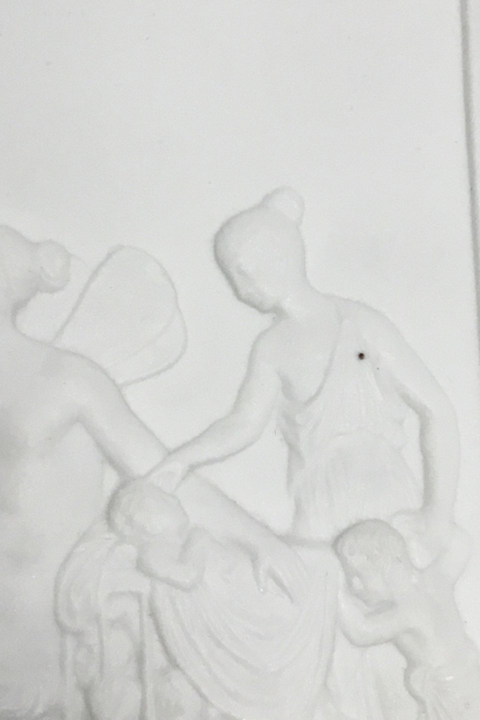 Royal Copenhagen Bisque Plate "The ages of Love" no. 115. Measures 31cm x 12,5cm. Tiny dot-shaped burning flaw, please see picture. Copy by Christian Christensen in 1841, after Thorvaldsens original from Rom 1824.