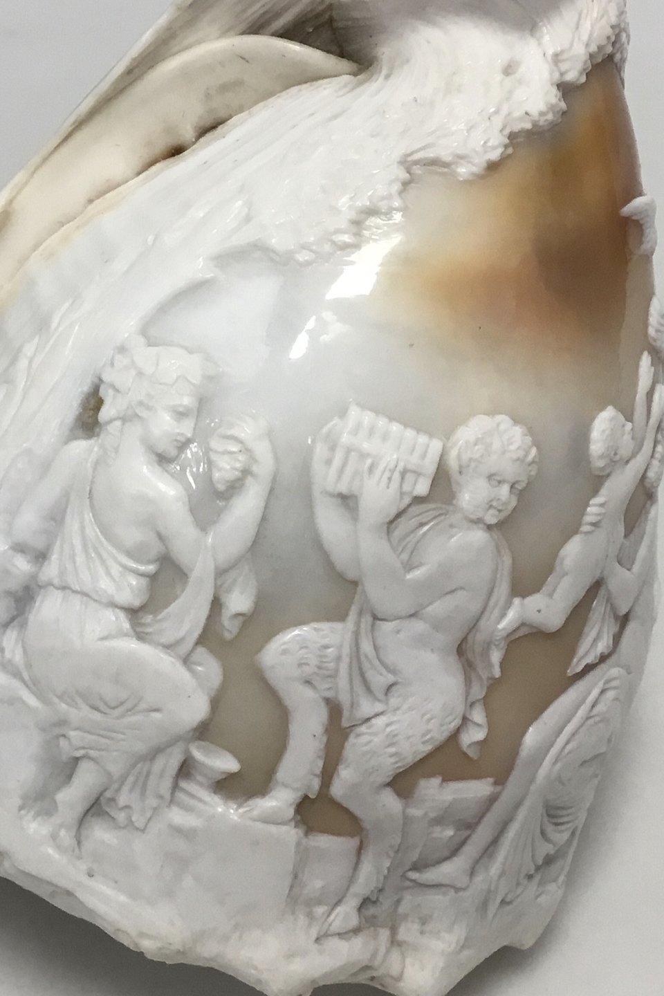 Cameo carved conch with classic motives. Victorian era ca. 1880. H: 15,5 cm (6 7/64")