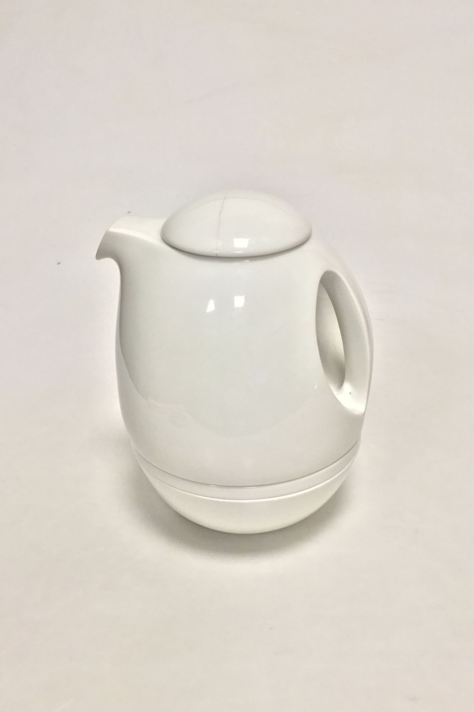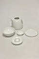 Royal Copenhagen white porcelain Coffee Pot with lid, small tray, egg cup and bowl, all in one. Lid with damages, please see pictures. H: 20 cm (7 7/8")