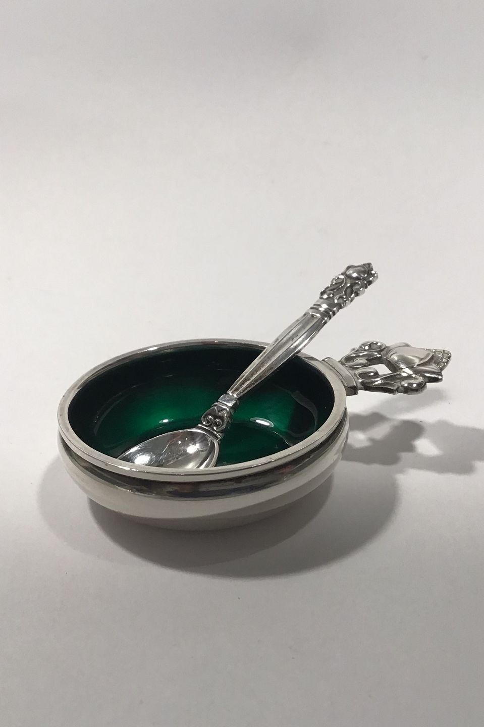 Georg Jensen Sterling Sølv Konge Saltkar No 62 (Grøn emalje) og Saltske Måler 4.1 cm Ske 6 cm
