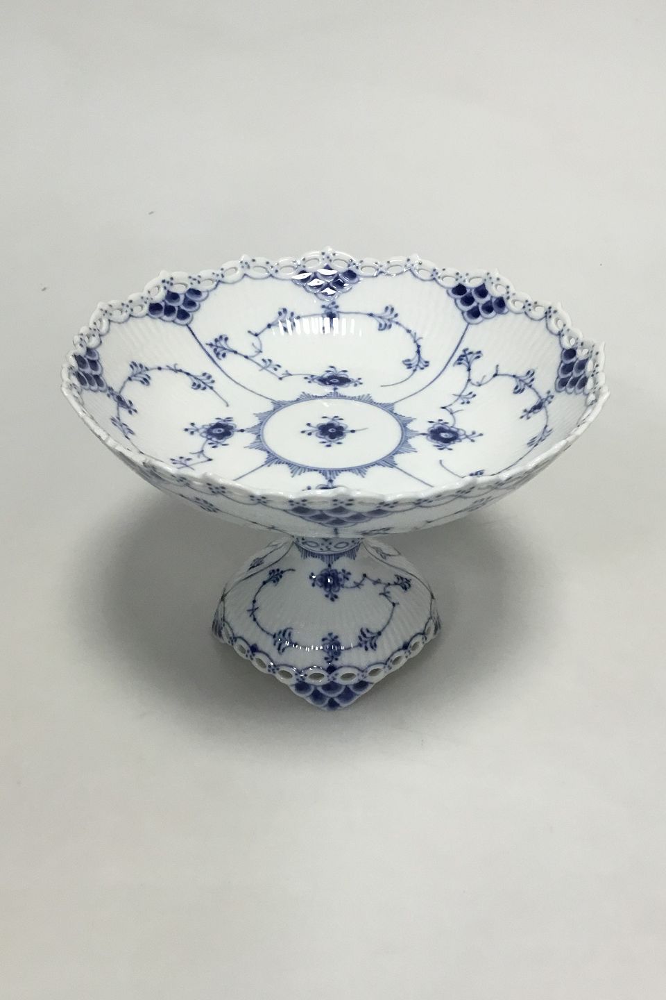 Royal Copenhagen Blue Fluted Full Lace Cake Bowl on Foot No 1020. Measures 14.5 cm x 20.5 cm / 5 45/65 in. x 8 5/64 in. Chips on edge.
