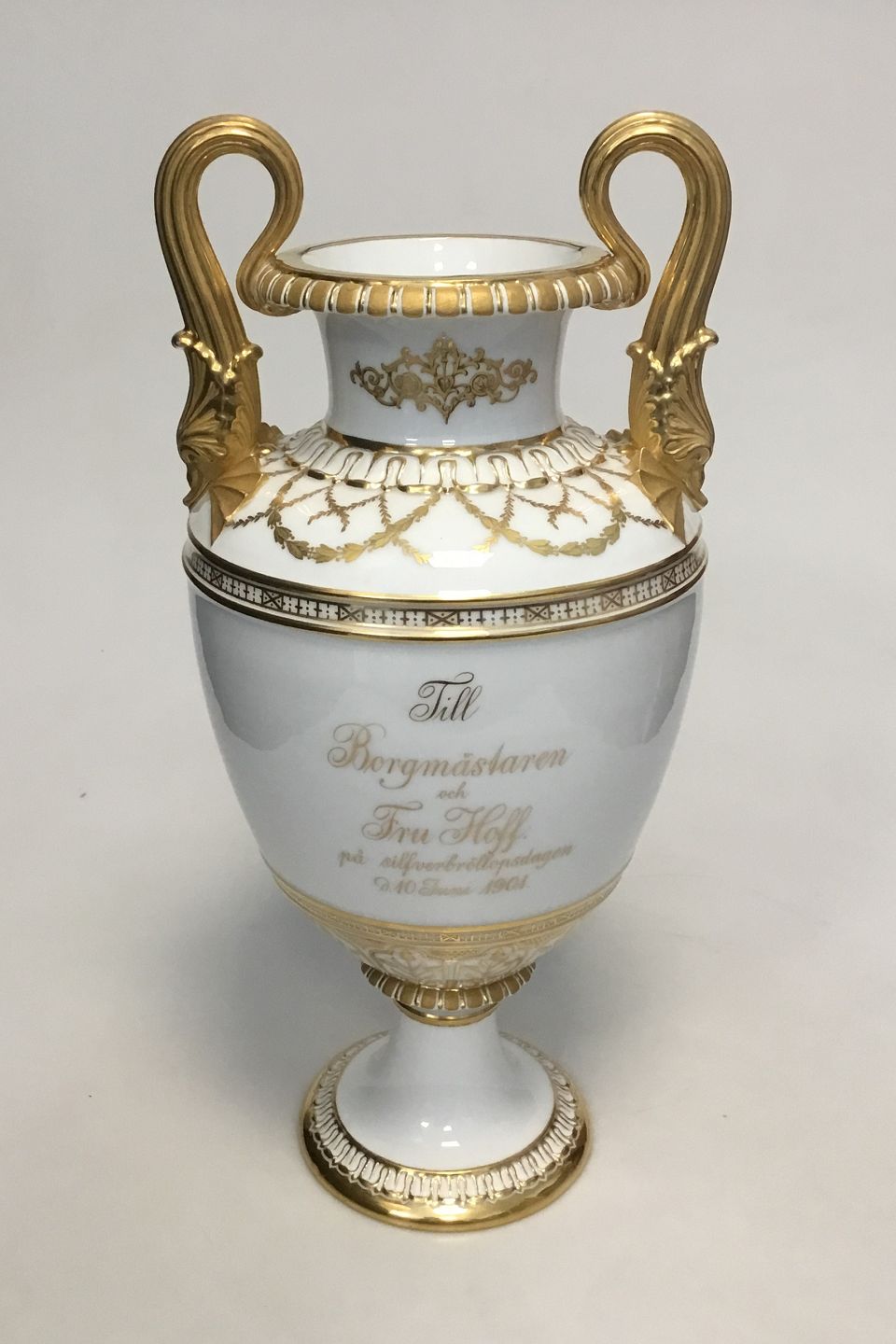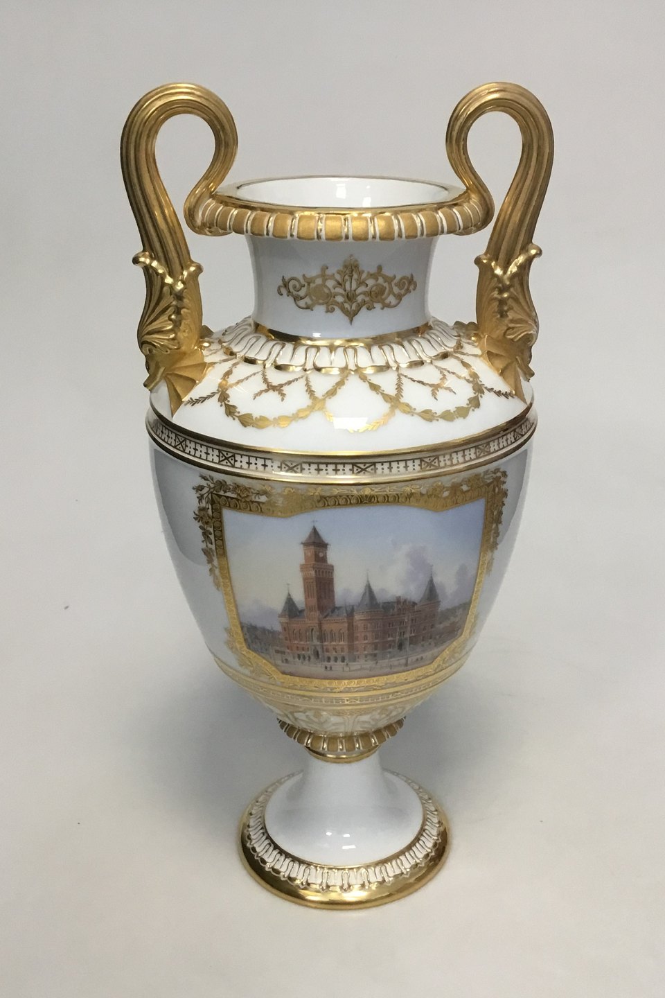 Royal Copenhagen Amphoravase with inscription and picture of Helsingborg City Hall. "To the Mayor and Mrs. Hoff on the Silver Wedding Day, June 10, 1901". Measures 41 cm / 16 9/64 in.