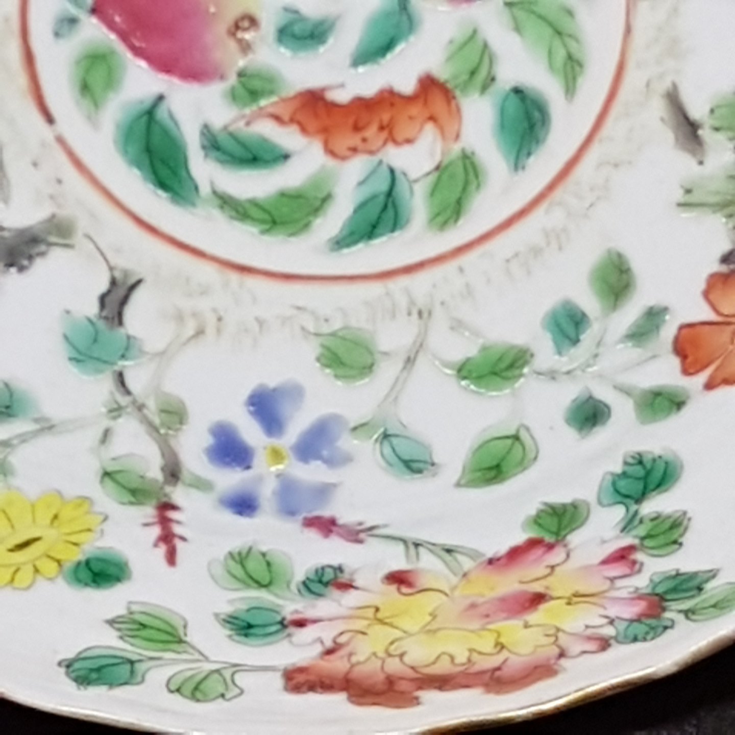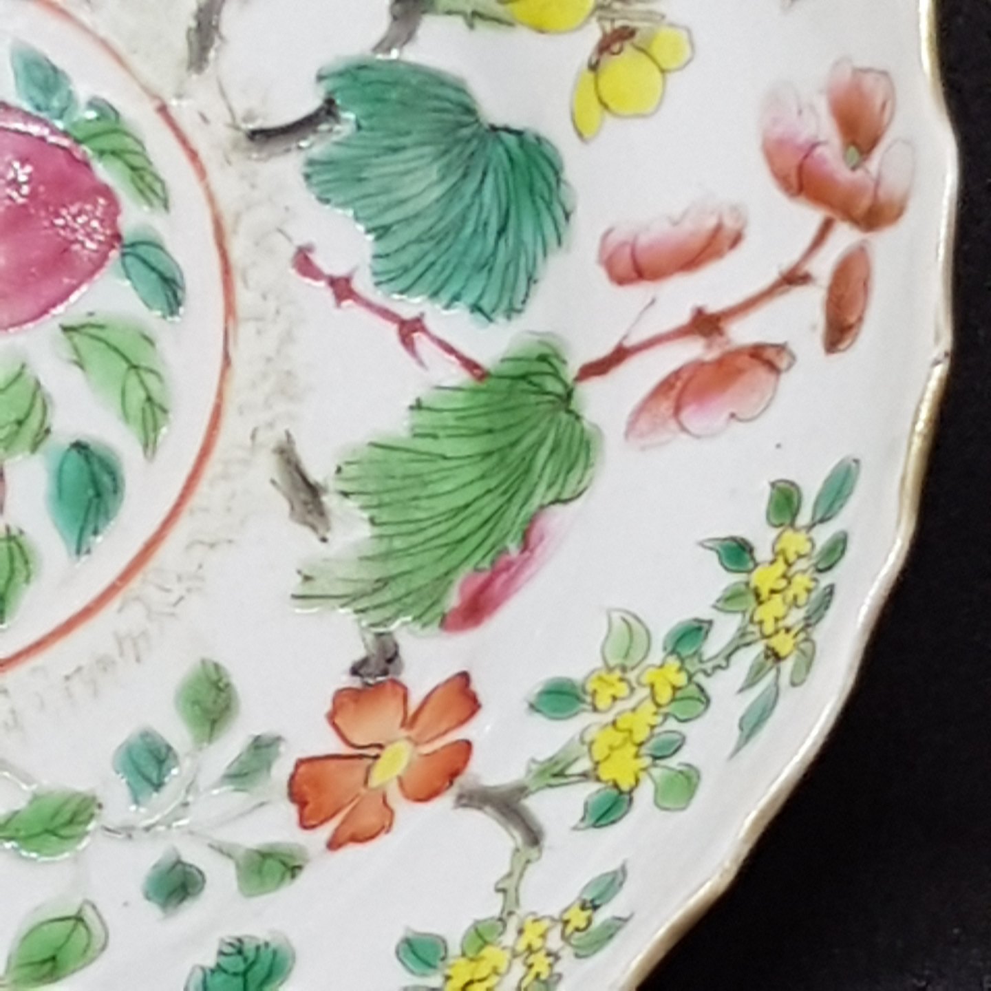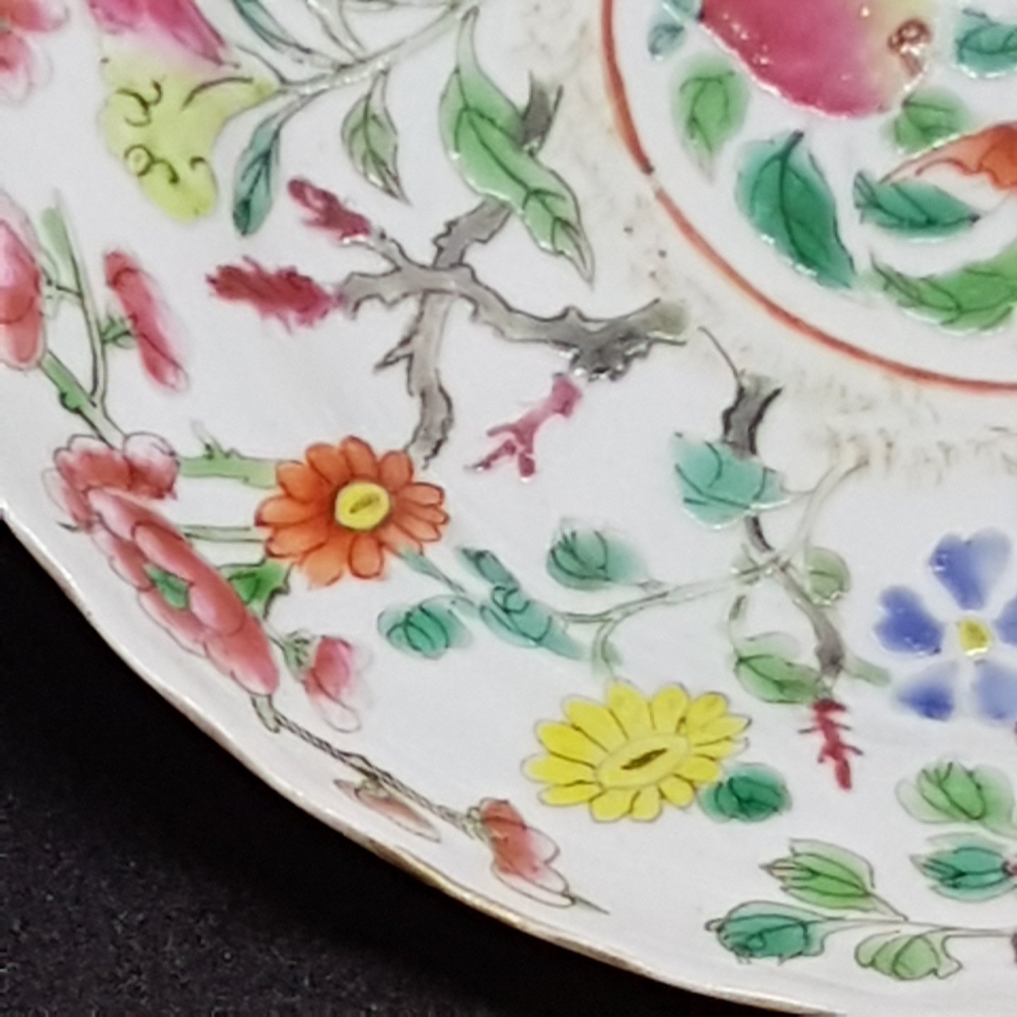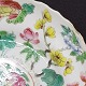 Kinesisk famille rose porcelænstallerken med Daoguang (1820-1850) mærke og fra perioden. Flot dekoreret med ferskner og flagermus i centrum, samt blomster og blade rundt om. Bagside med flagermus og periodemærke. Svejfet kant med guldbemaling. Mindre brændingsfejl på kant. Diameter 13,5 cm.