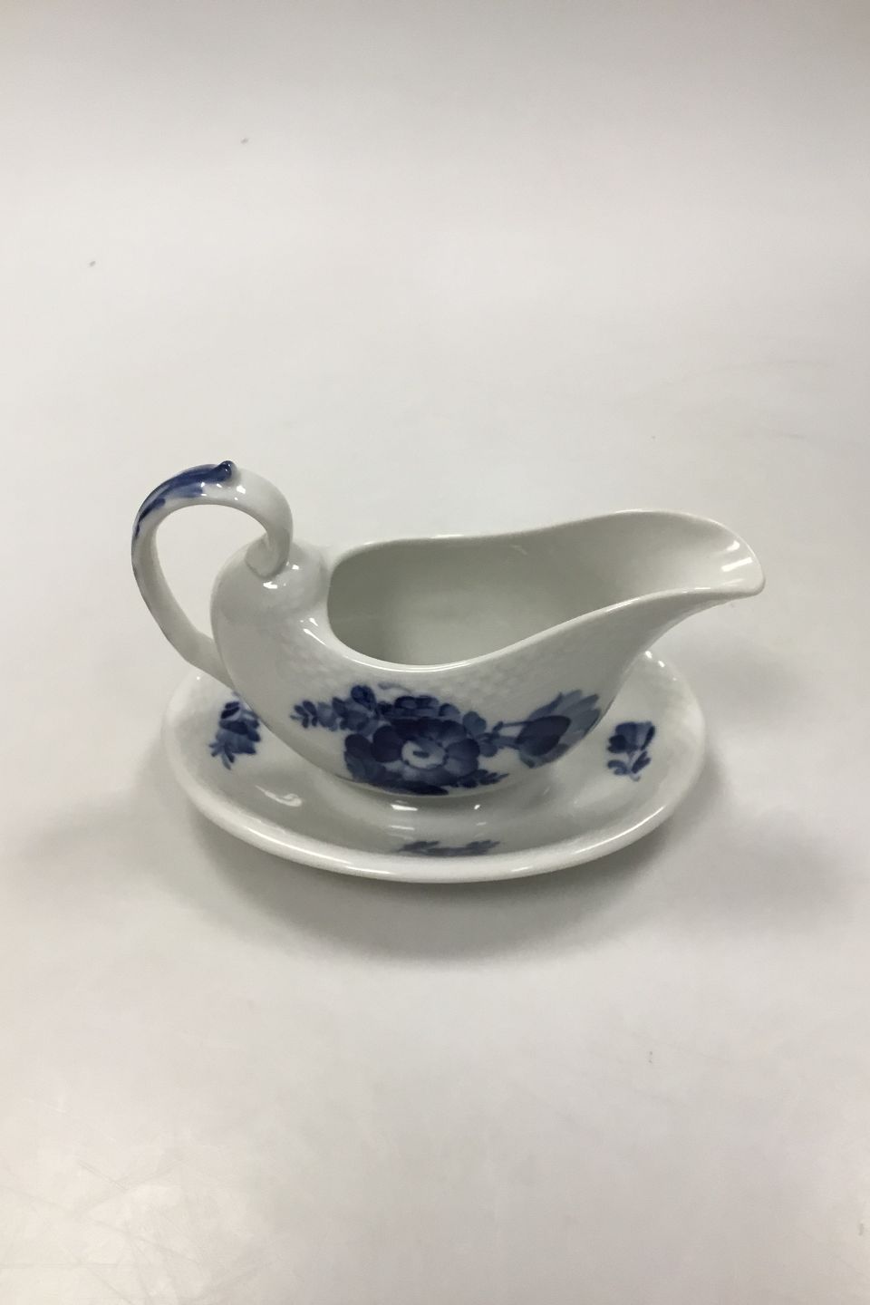 Royal Copenhagen Blå Blomst Flettet Saucekande med Fast Underfad No 8068. Måler 12,5 x 16,5 cm (4 59/64 x 6 1/2 in). Underfad 17 cm (6 11/16 in).