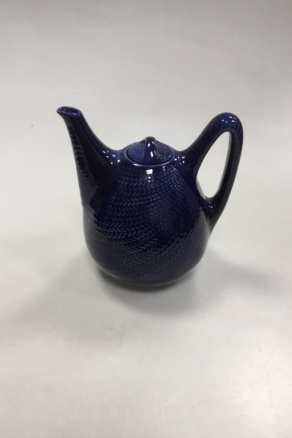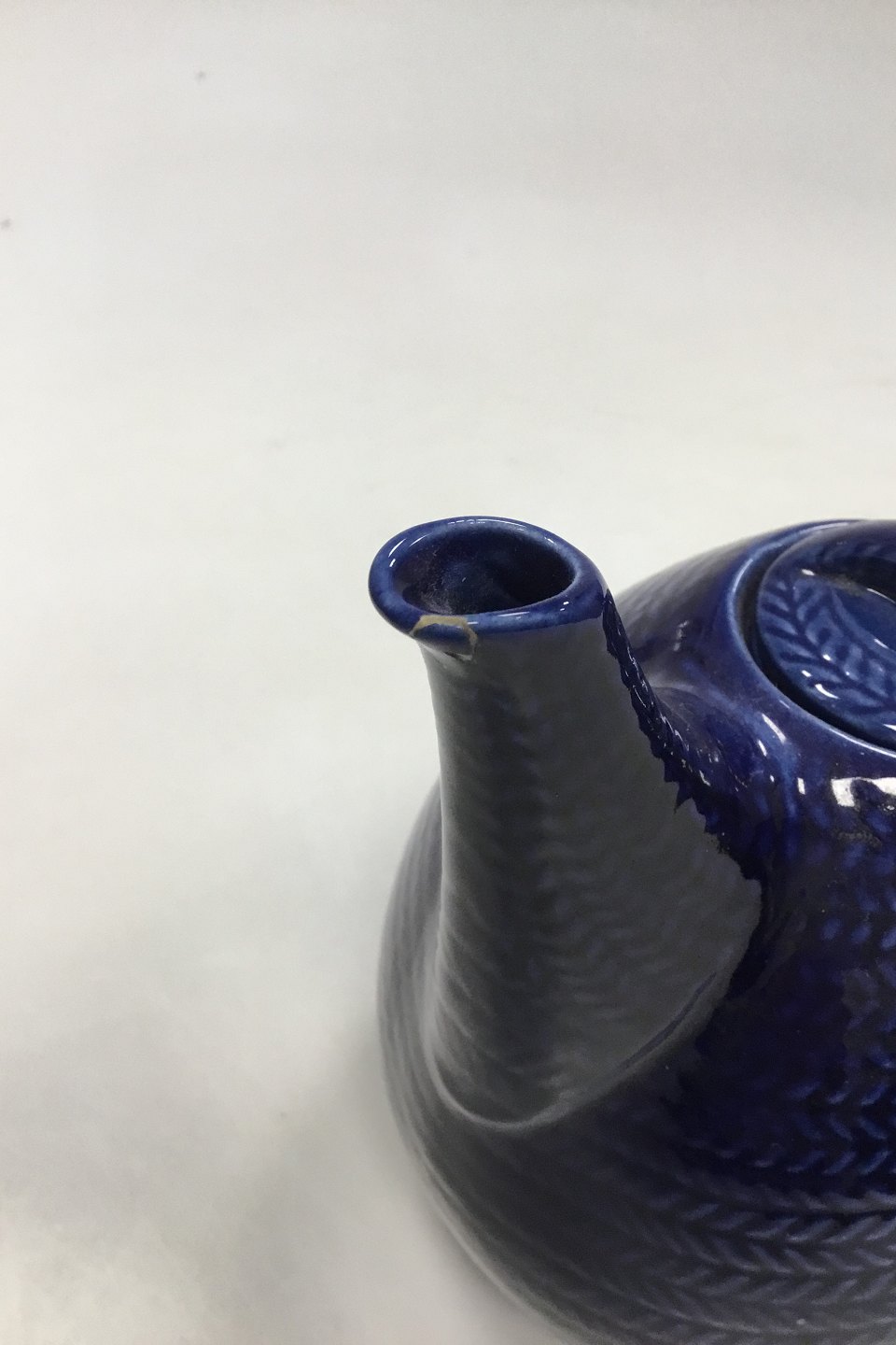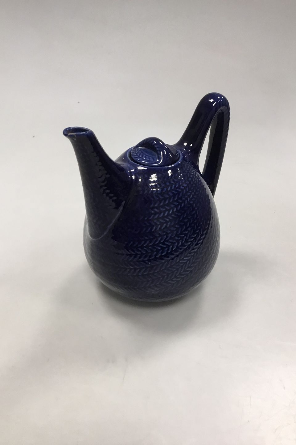 Rørstrand Blå Eld/Blå Ild Thekande. Måler 18,5 cm Høj målt til tuden. Indeholder 1 l. Med limet skår i tuden.