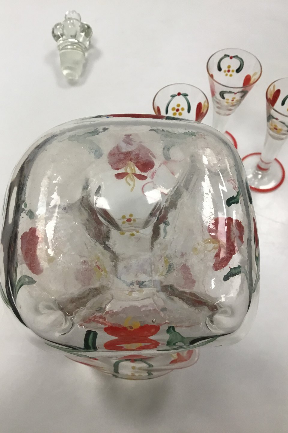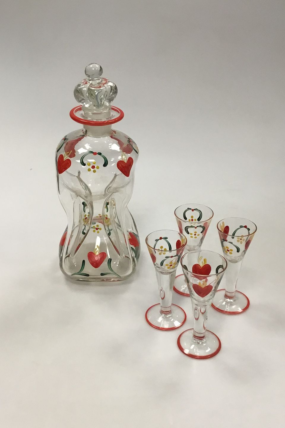 Holmegaard Kluk Kluk Decanter with 4 schnapss glasses decorated with red hearths