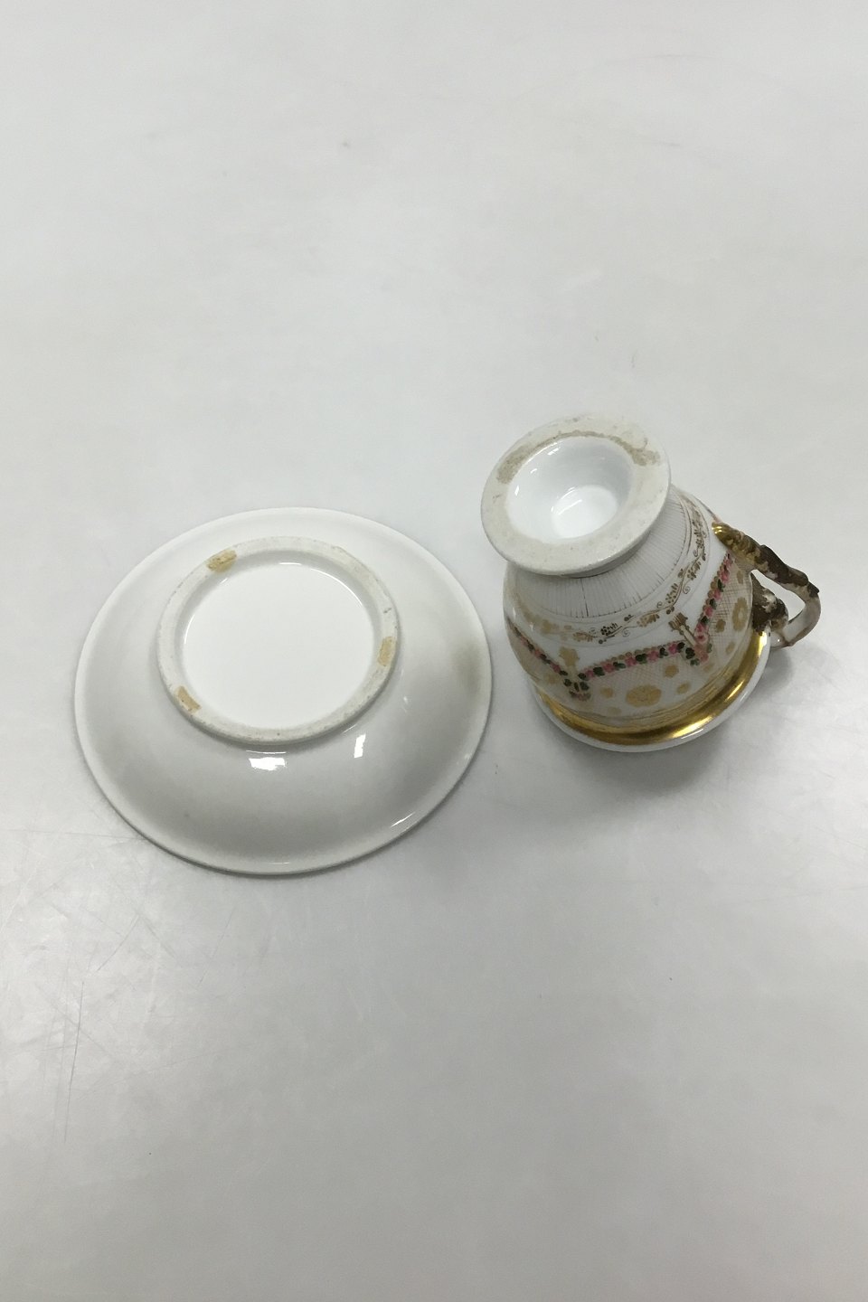 Old Cup and Saucer Decorated with Flowers and gold. Repair on handle and wear. Measures 12 cm / 4.72 inch