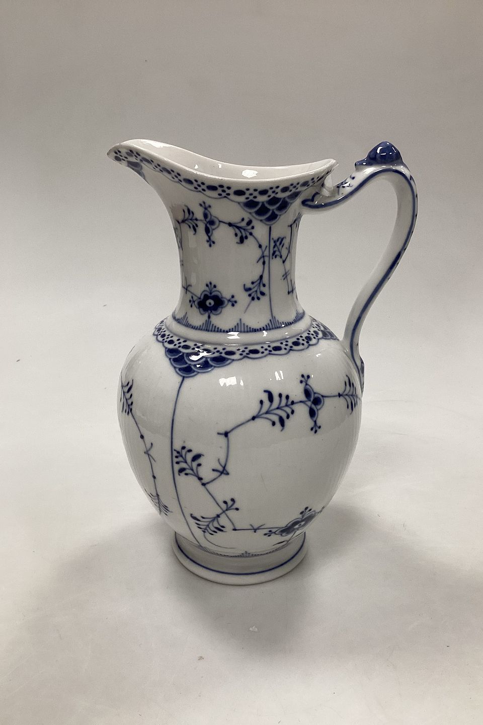 Royal Copenhagen Musselmalet Halvblonde Chokoladekande No 722. Måler 23 cm. Har brænding mærker / afslag ved tuden, se billeder.