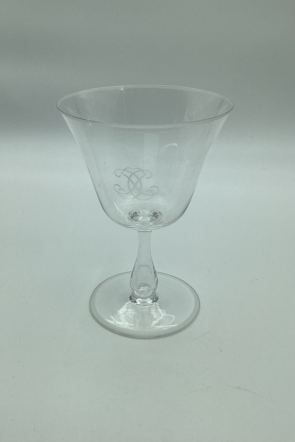 Wine glass with monogram on bell-shaped basin and hollow stem. Unknown origin. Presumed to have been manufactured between 1930-1950. Appears in good condition. H. 15 cm (5.90 inches)
