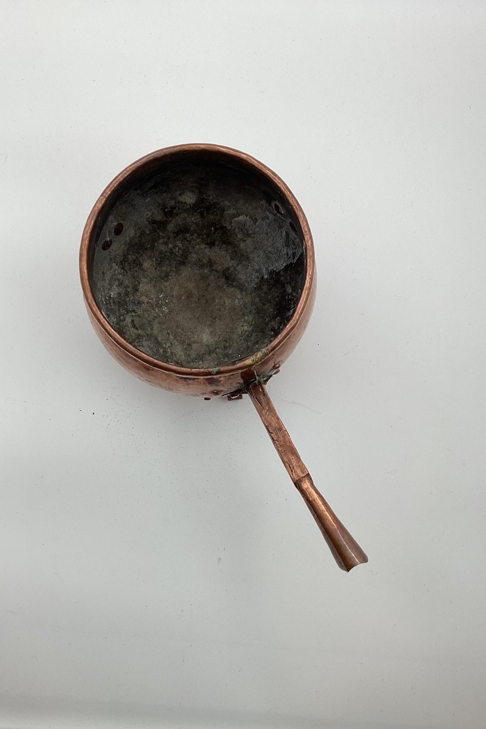 Smaller Danish copper pot with handle standing on three legs from approx. 1850. In good condition. Tinned inside. Dimensions: H. 11 cm (4.33 inches) L. 21 cm (8.26 inches). Opening diameter 10 cm (3.93 inches)