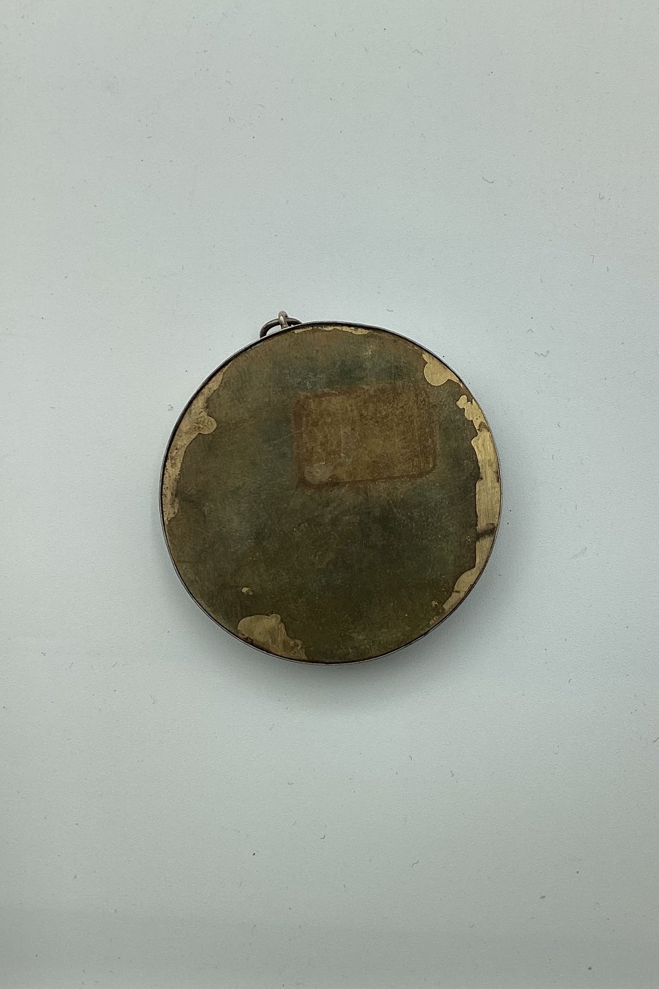 Watercolor miniature portrait of blonde girl with bow in hair from c. 1900. Inserted in metal frame with glass. Signed by unknown artist at bottom right. In good condition. Dimensions: 5 cm in diameter (1.96 inches)