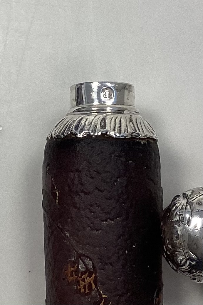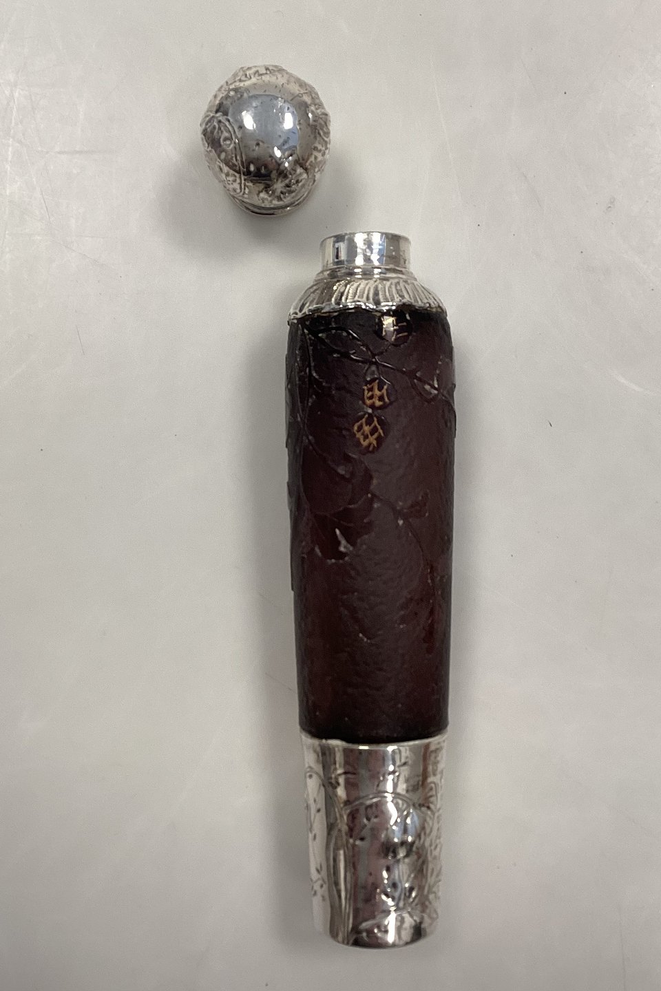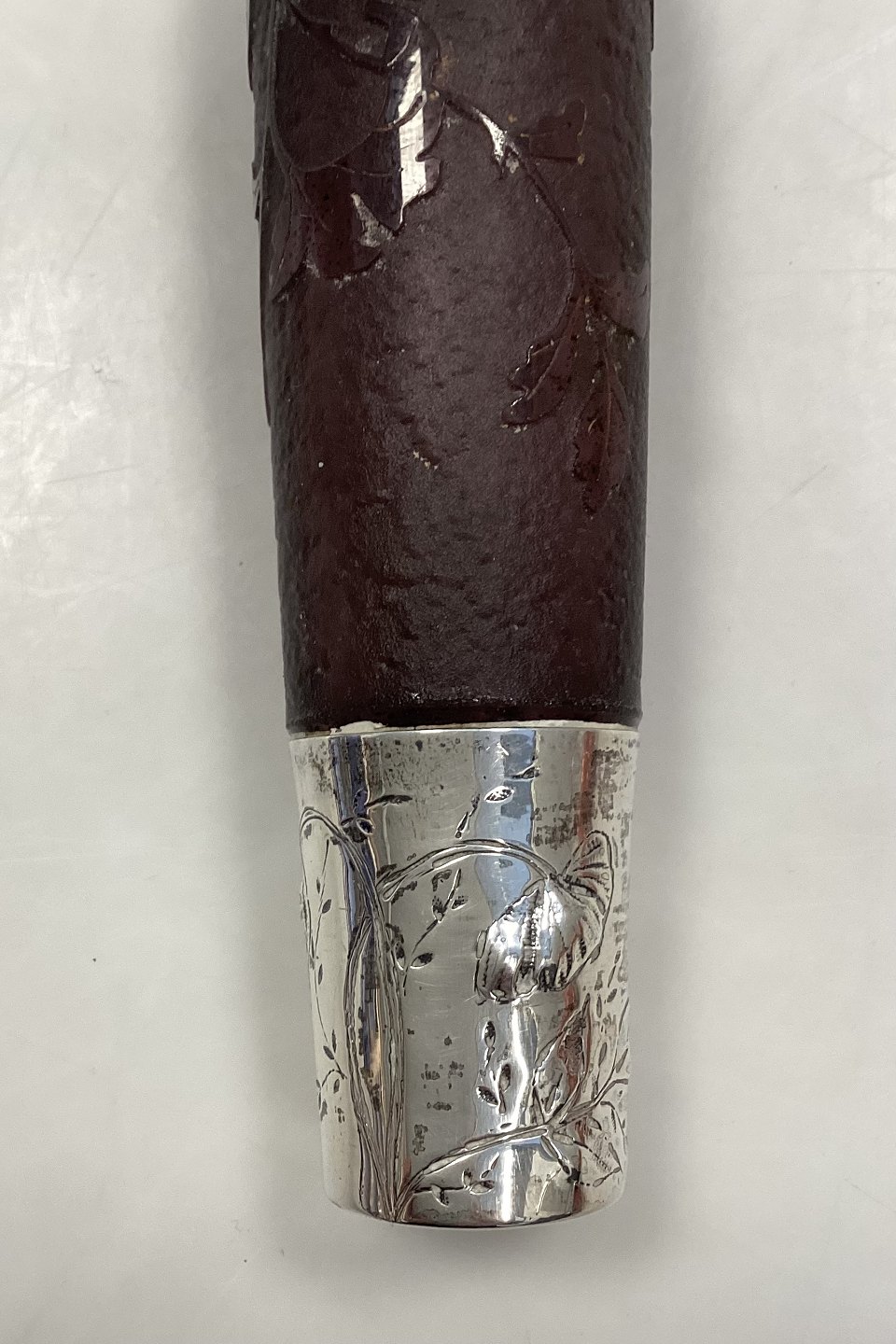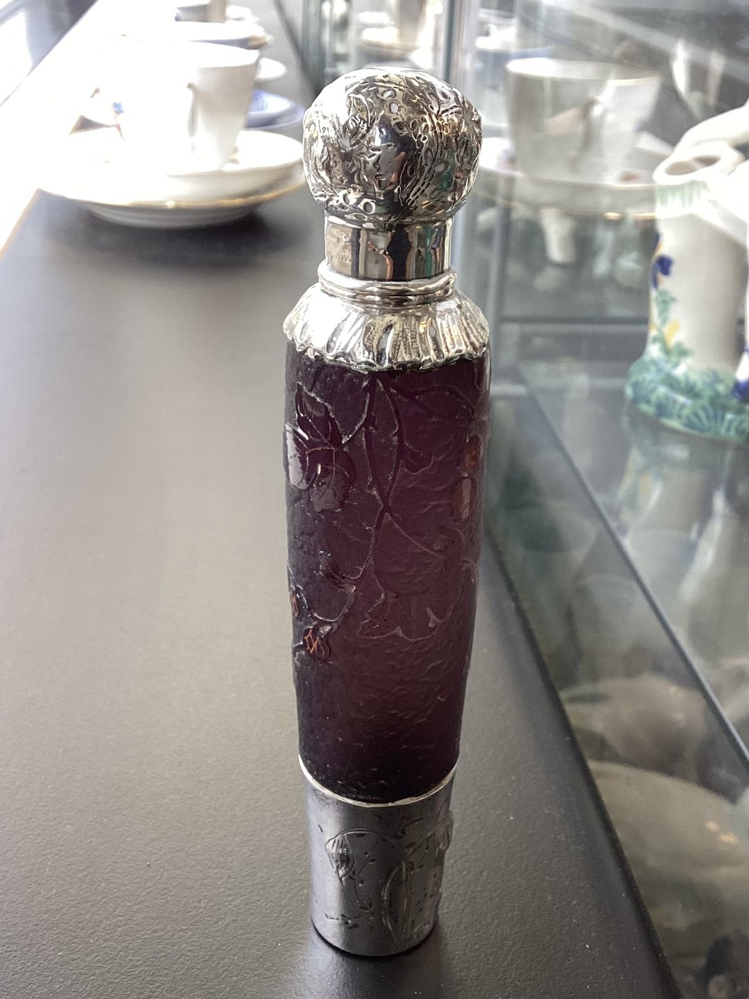 Fransk Antik Art Nouveau flacon i bordeaux glas med blomsterdekorationer og bladværk i relief fra slutningen af 19. årh. I både top og bund sølvmontering med sølvstempel. I god stand. Ingen skader. H. 15 cm (5.91 inch)