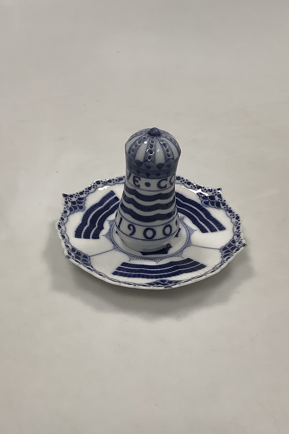 Royal Copenhagen Musselmalet Saltbøsse fra Paris Verdensudstillingen 1900. Måler 7 cm. / 2 3/4 inch