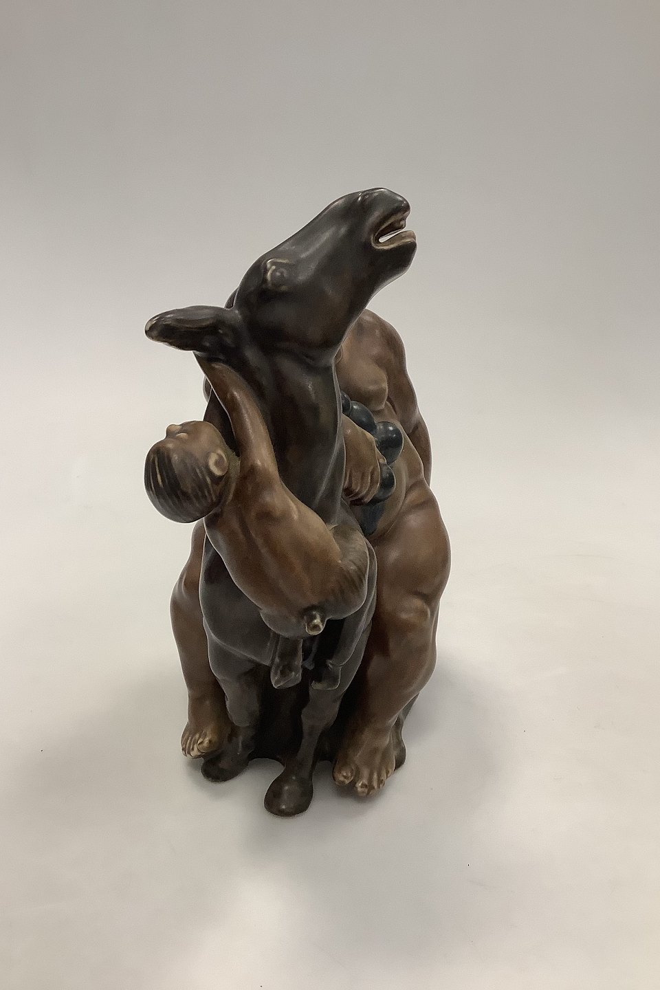 Kai Nielsen Stoneware Figurine no. 4026 Sleeping Bacchus and Climbing Faun on a Donkey. 23 cm H (9 1/16"). 18 cm W (7 3/32"). In perfect condition.